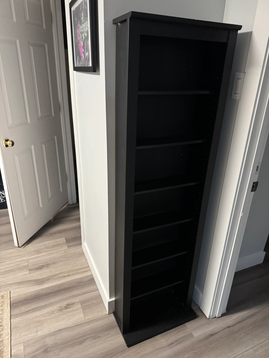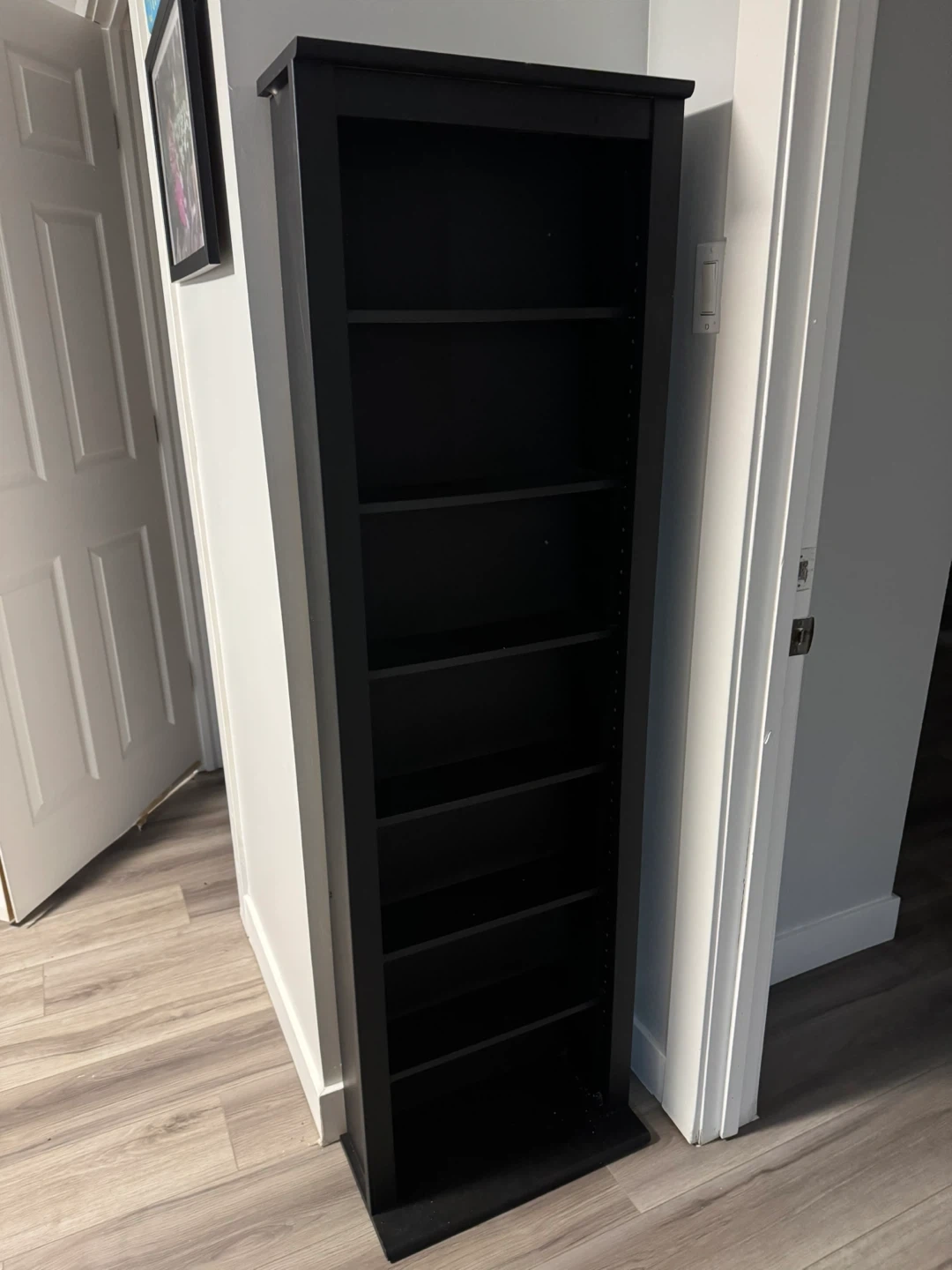 Selling a black media storage tower. It's in great condition and ready for a new home. Perfect for storing DVDs, CDs, or books! It's a sleek and simple design that fits well in any room selling because I have a few you can look at my listings. Thank you