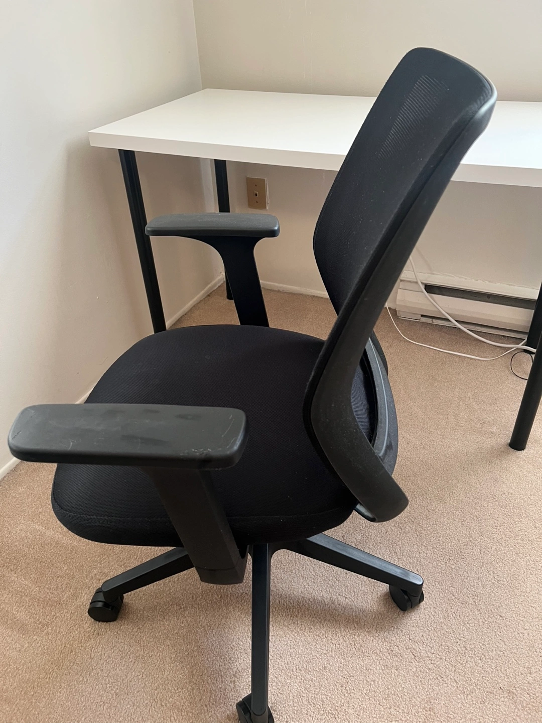1831. Comfortable and functional office chair in good condition. Features a breathable mesh back, cushioned seat, and smooth-rolling wheels. Armrests show some visible wear and surface scratches (see photos), but overall the chair is sturdy and works perfectly. • Adjustable height • Smooth-rolling casters • Mesh back for breathability • Slight wear on armrests 2. Minimalist and sturdy desk in excellent condition. Great for studying, working from home, or as a computer desk. Purchased from IKEA, this desk features a clean white surface and durable black legs. No damage or stains on the tabletop. Slight signs of normal use on the legs. • Dimensions: Approx. 120 cm (L) x 60 cm (W) x 74 cm (H) • Easy to disassemble for transport • Stable and lightweight $30 for both $15 for each Pickup only