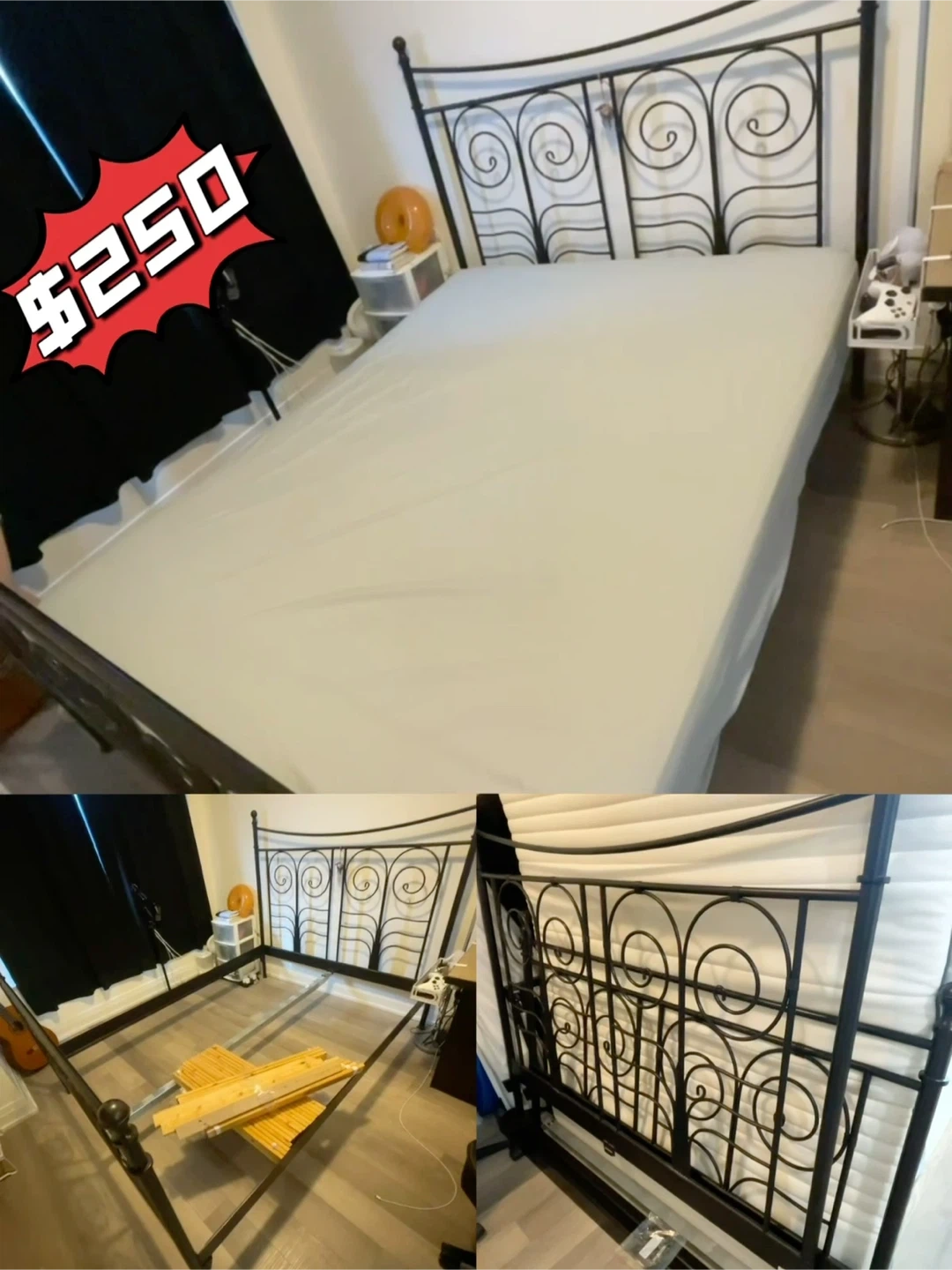 Selling a queen-size black metal bed frame! It's in good condition and has a stylish, decorative design. Perfect for adding a touch of elegance to your bedroom. Along with an ikea mattress. Original price together are over $600. Asking $220