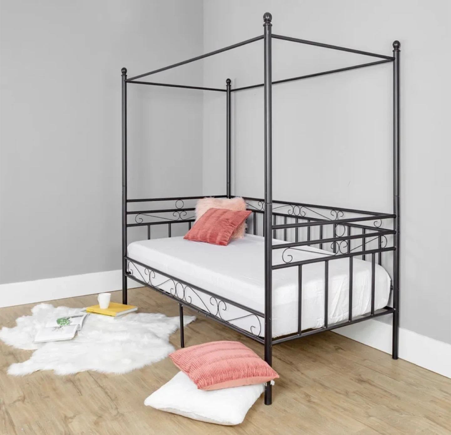 Selling a black metal canopy bed frame, perfect for adding a touch of elegance to your bedroom! This double-sized frame measures 78.3" in length, 41" in width, and 42.7" in height. It's in great condition and includes curtains