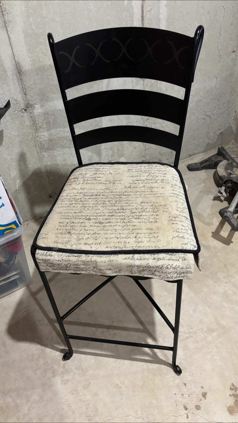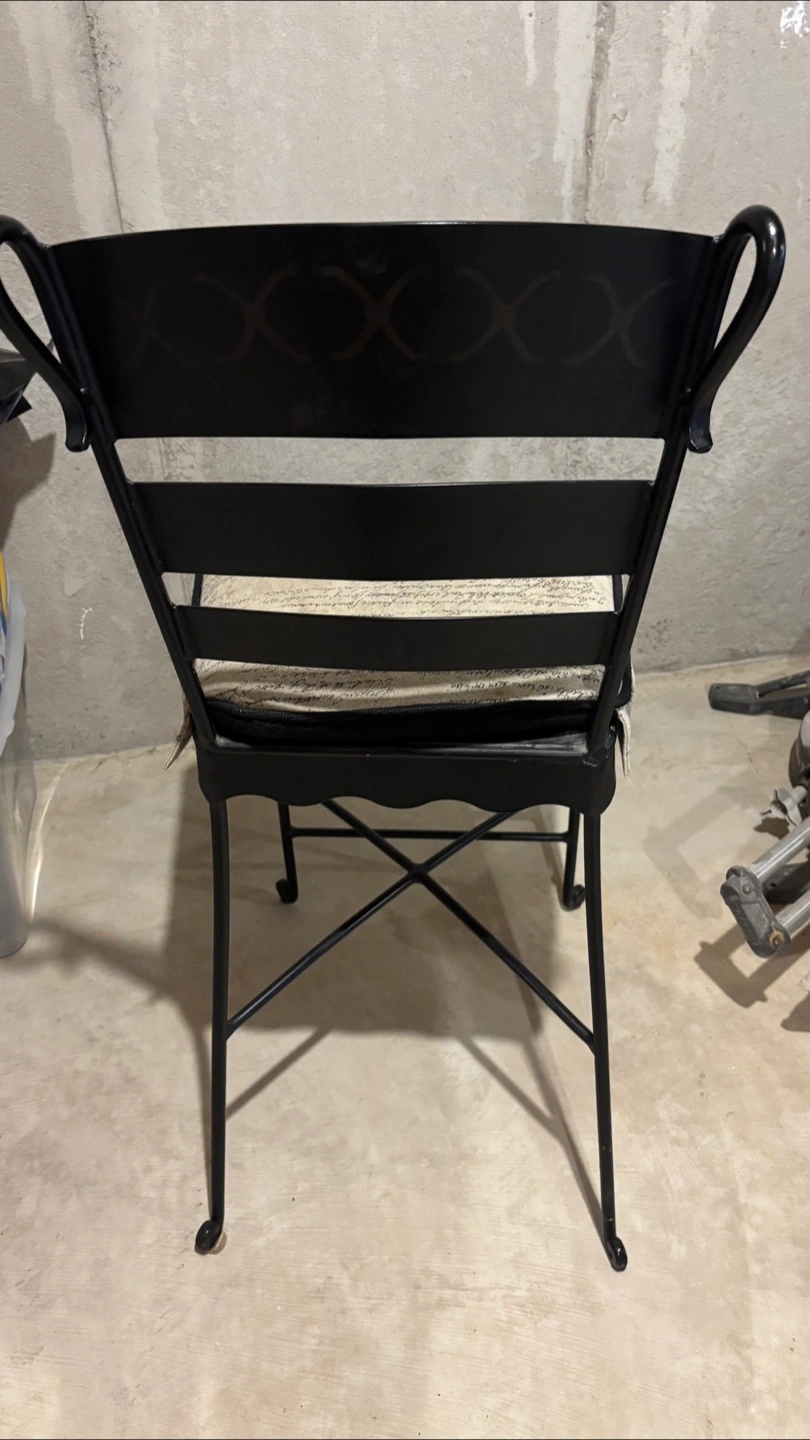 Selling a sturdy black metal chair. It features a padded seat for extra comfort. The chair has a unique design on the backrest. It's perfect for adding a touch of style to any room! You can buy however many you like! 8 total chairs. $40 each.