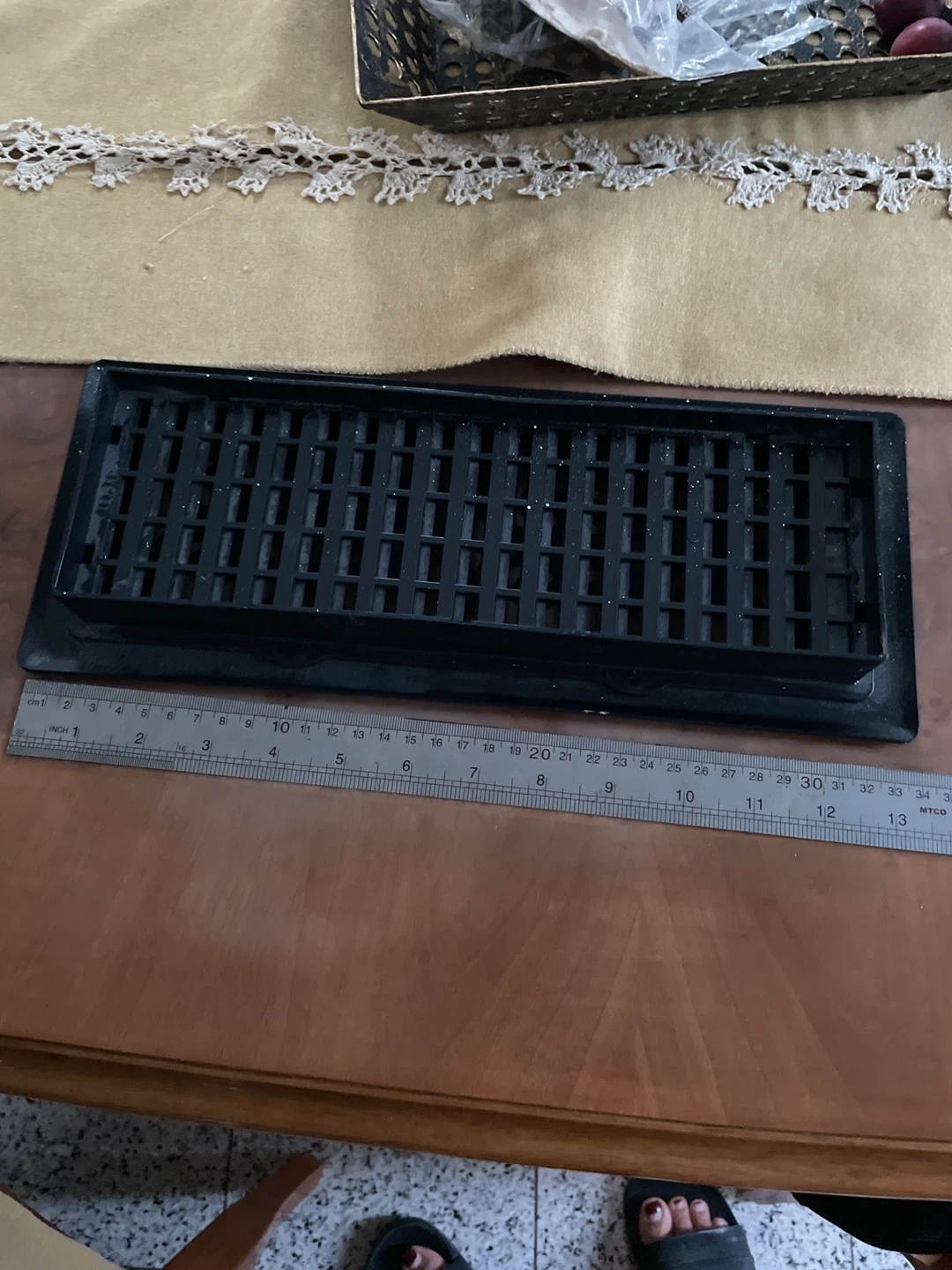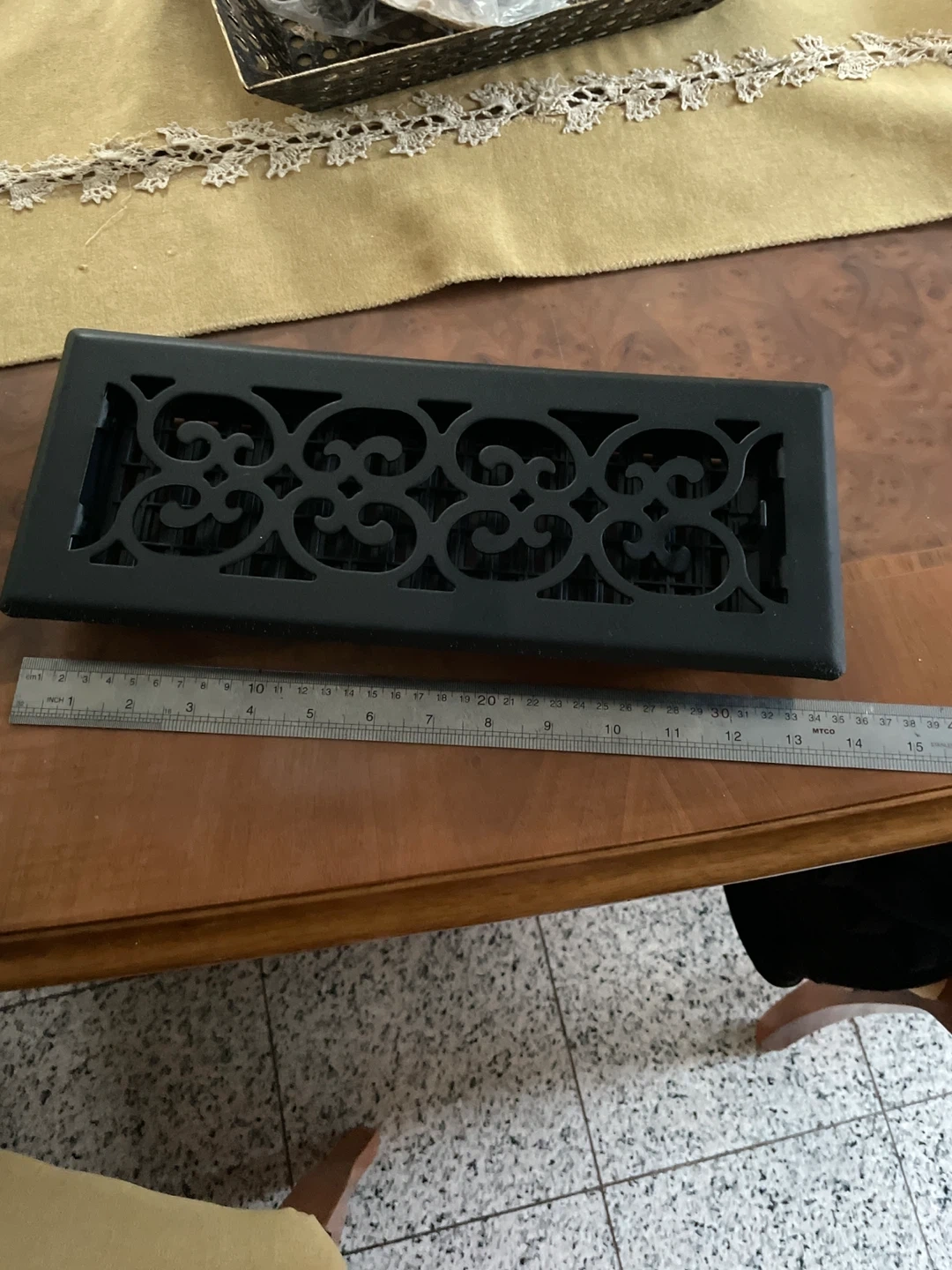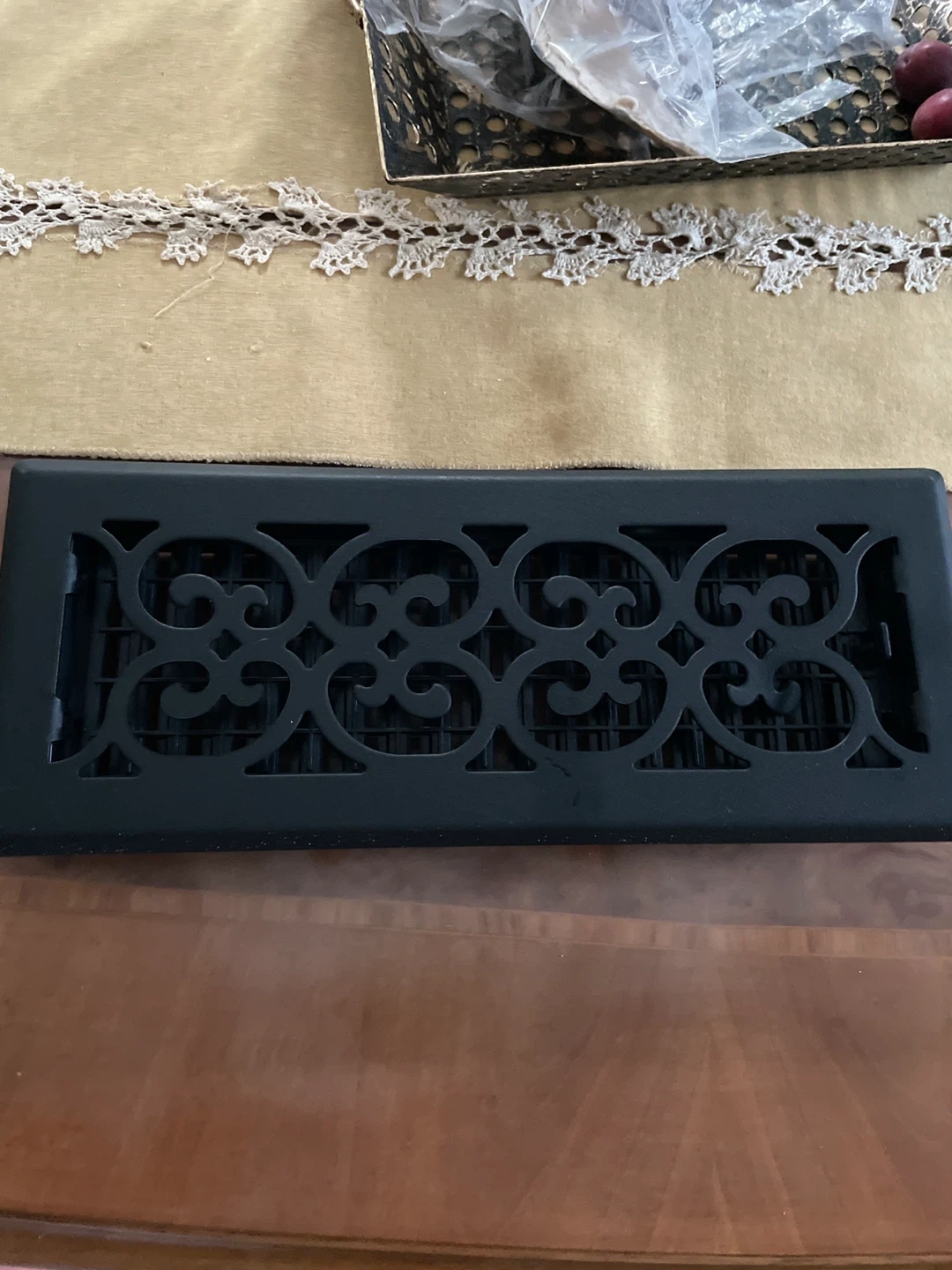 Here's a black metal floor vent cover. It measures approximately 14 inches long and 4 inches wide. It has a decorative design on the vent cover.my location is Yonge and Steeles North York