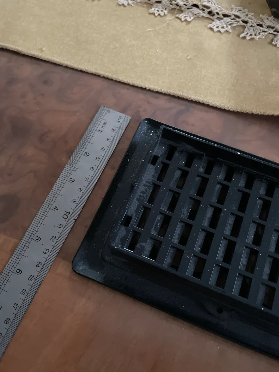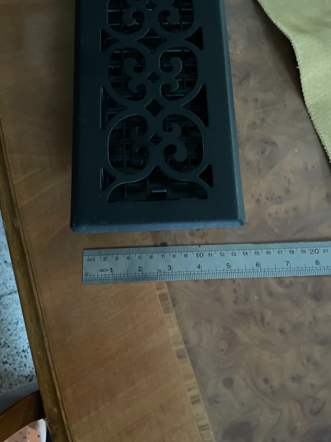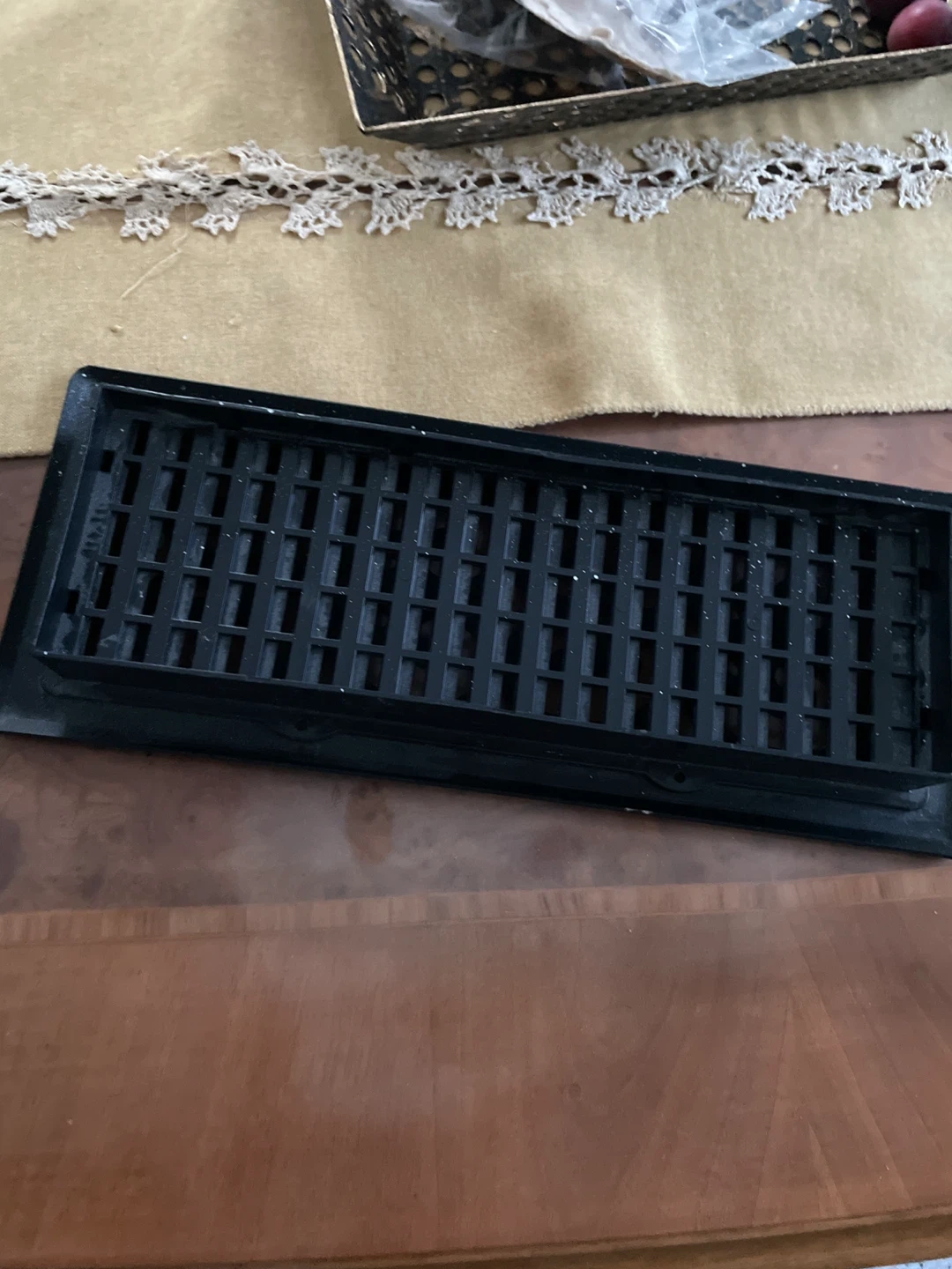 Here's a black metal floor vent cover. It measures approximately 14 inches long and 4 inches wide. It has a decorative design on the vent cover.my location is Yonge and Steeles North York