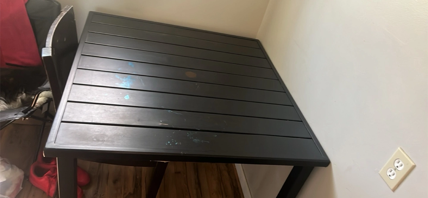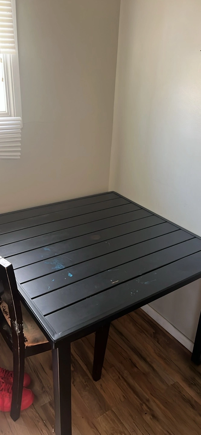 Selling a black outdoor dining table. It has some signs of use, including some scratches and marks on the surface, as shown in the photos. It's still sturdy and functional, perfect for a small dining area, kitchen, or outdoor area!