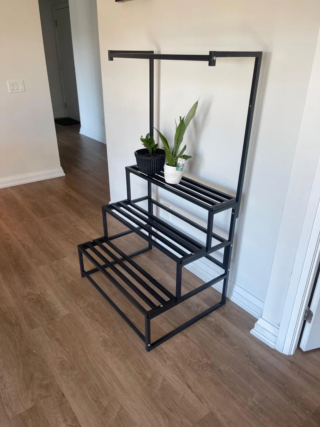 Looking to add a touch of modern to your home? This black metal plant stand is perfect! It features three tiers for displaying your favourite plants and a hanging bar up top. It's in great condition and ready to brighten up any space!