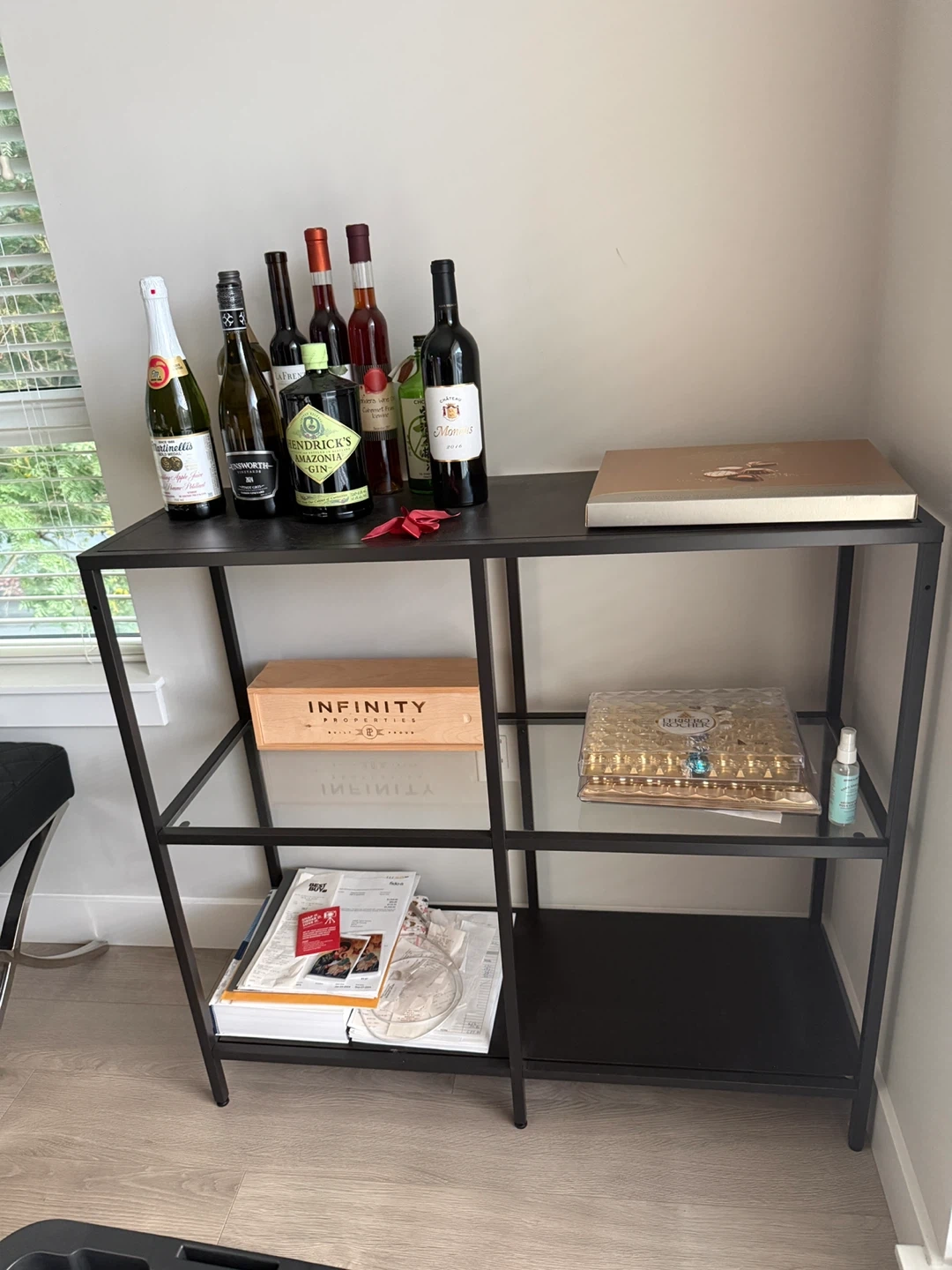Selling a black metal shelf unit. It's in great condition and perfect for displaying items or for extra storage. It has a modern, minimalist design that would fit well in any home $50 for one shelf $80 for two shelves