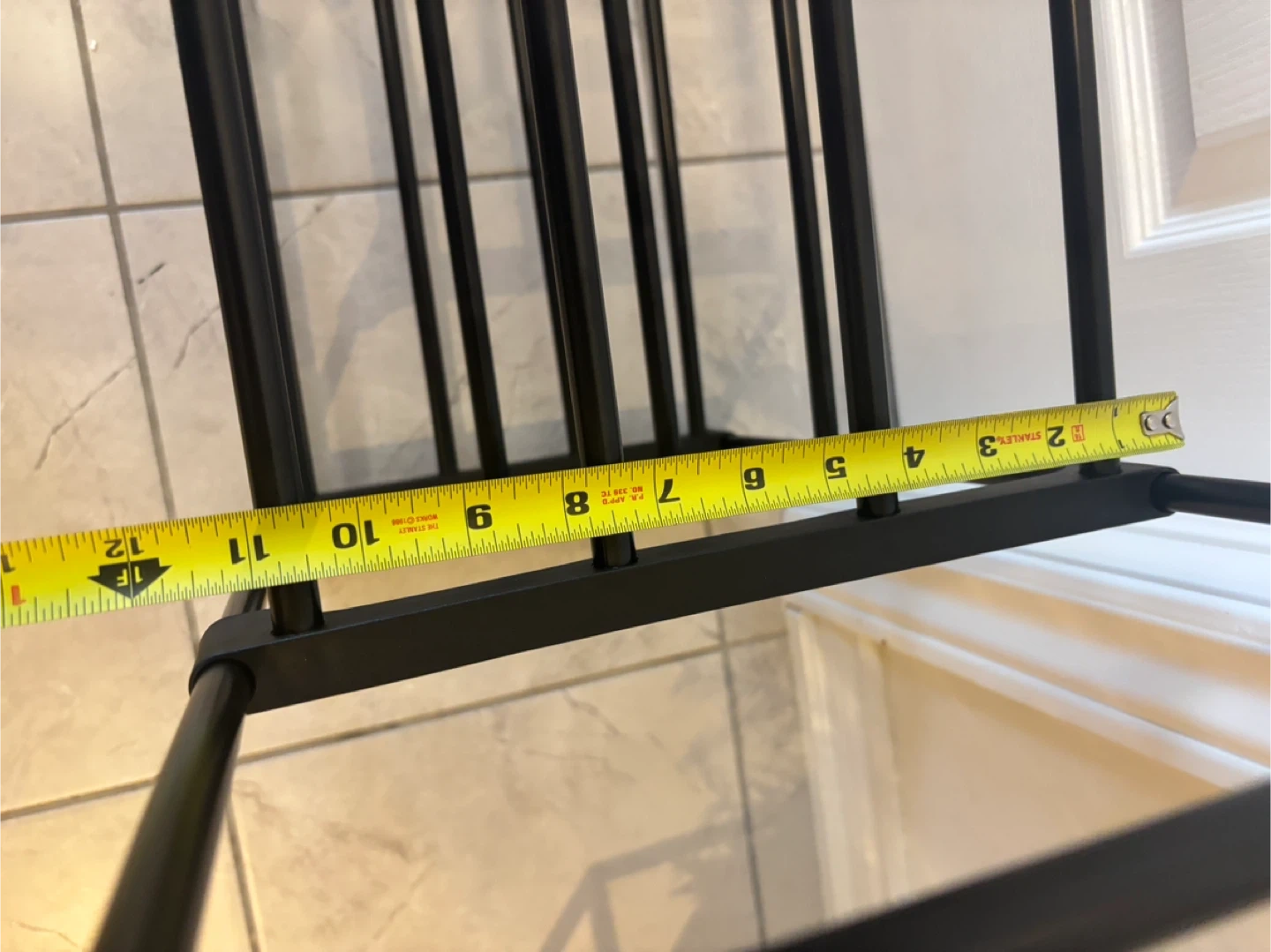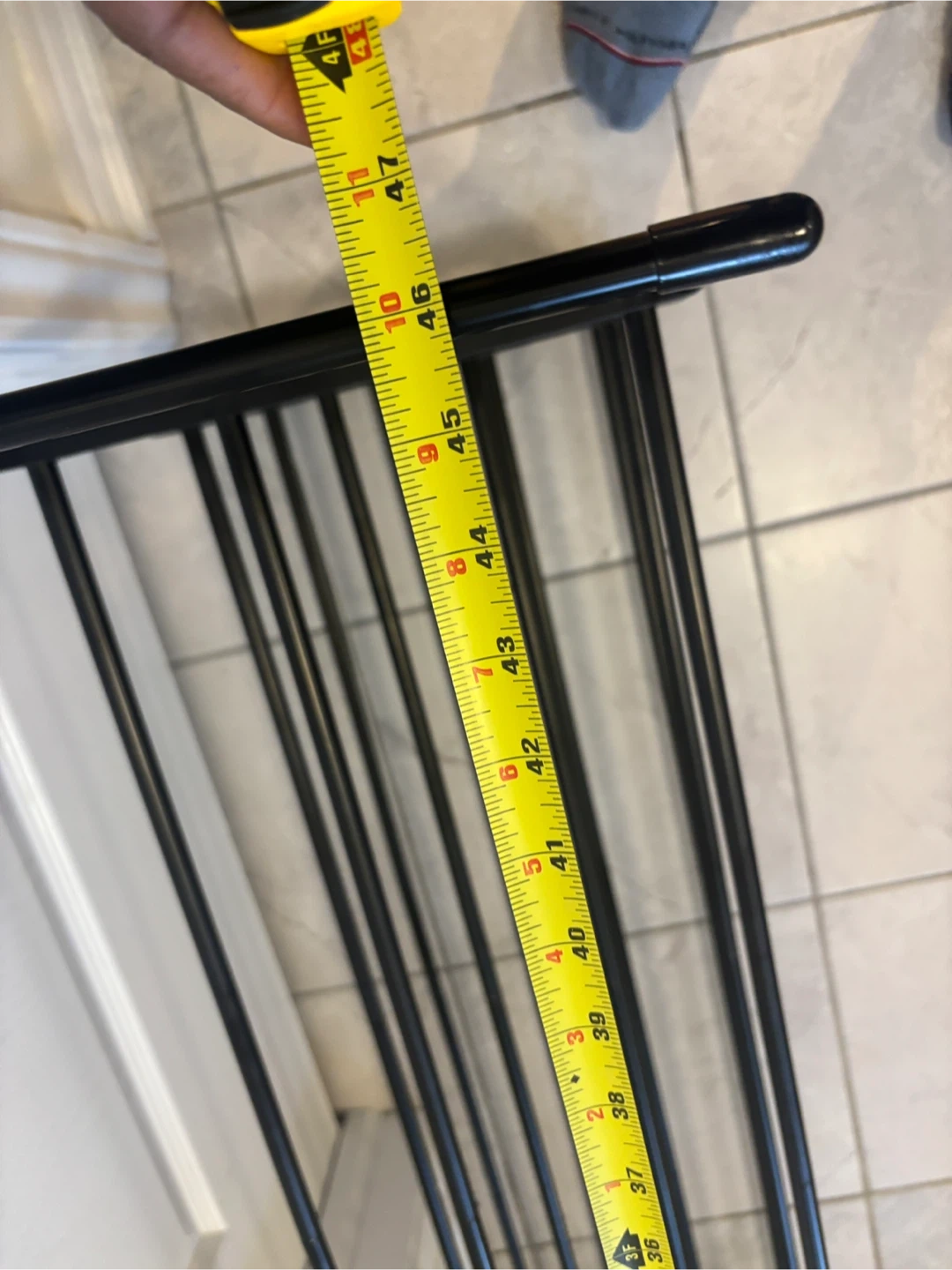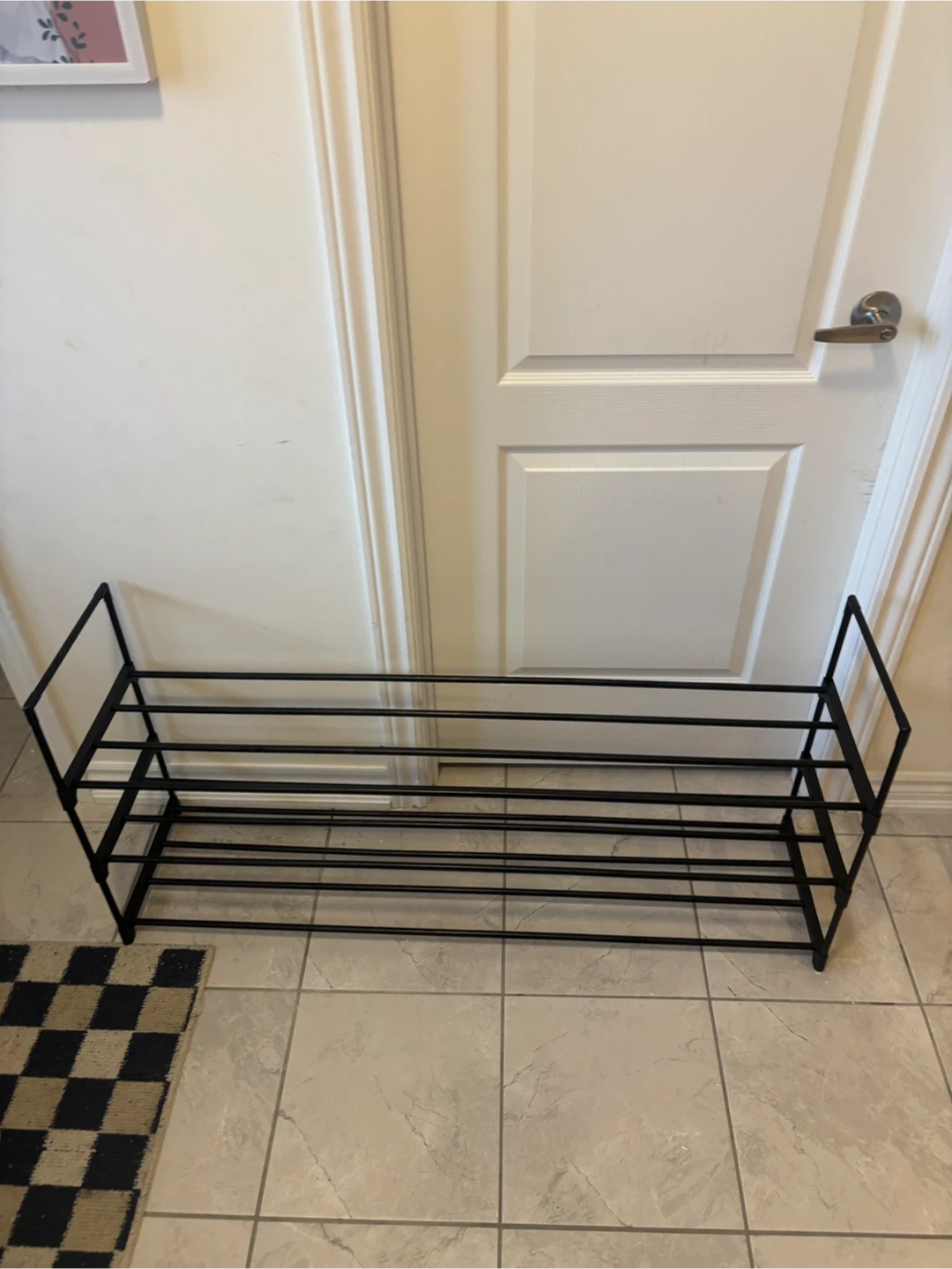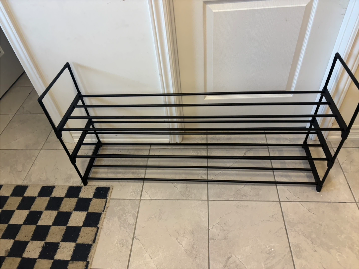 202I have a black metal shoe rack for sale. It's in great shape and ready to organize your shoes! It measures approximately 47 inches tall, 23 inches wide, and 12 inches deep