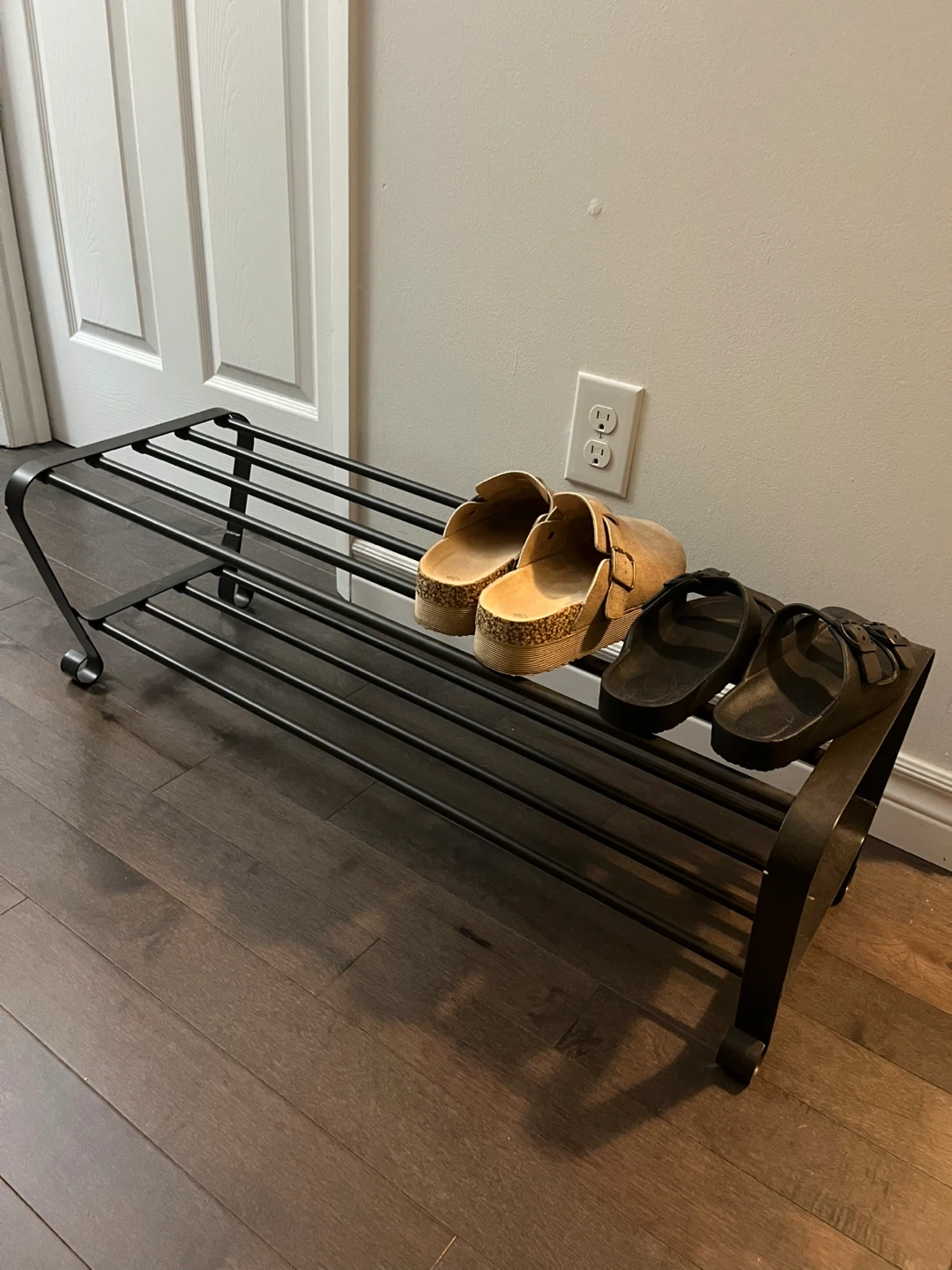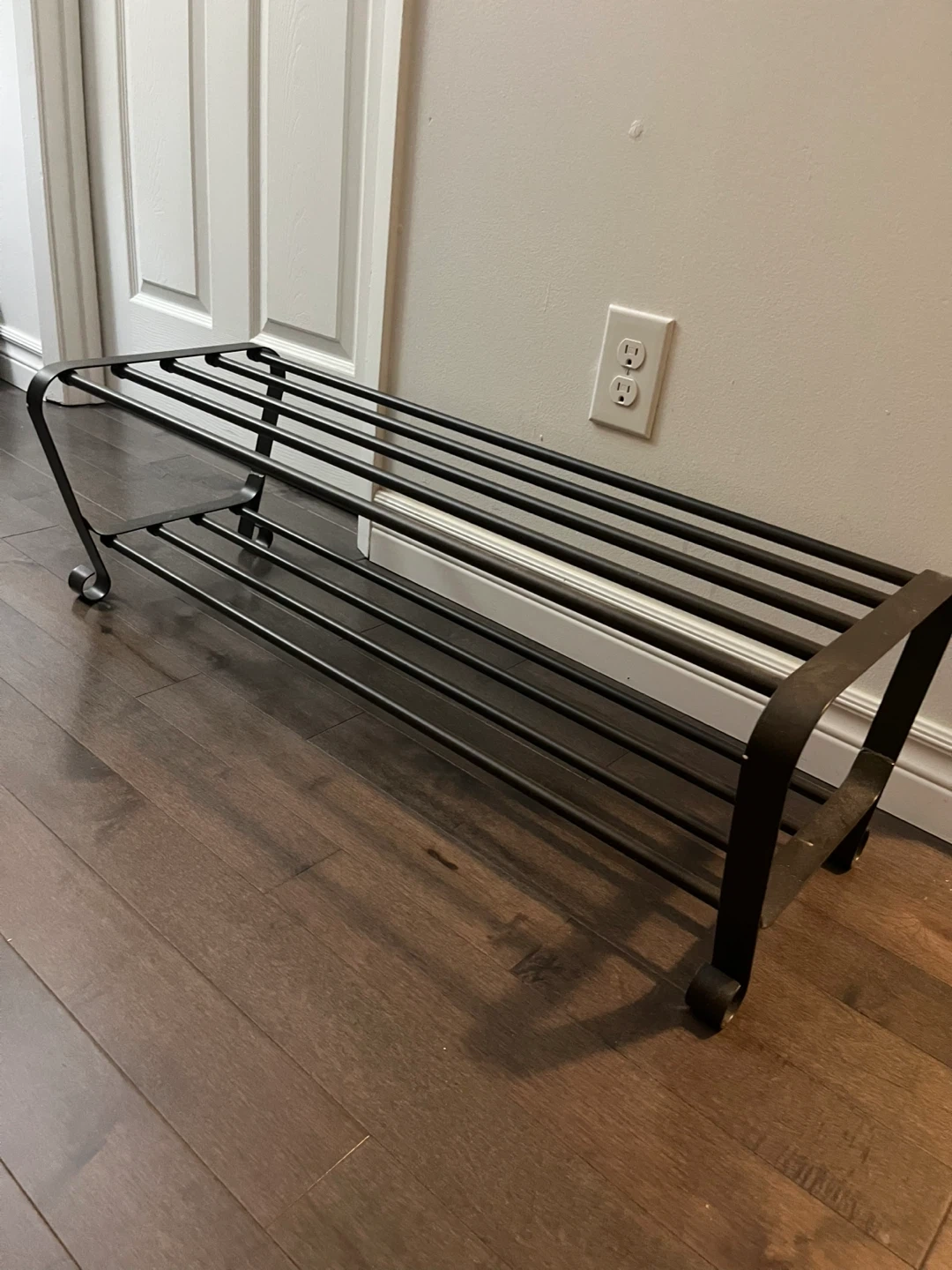 Selling a black metal shoe rack! It's in great condition and perfect for organizing your footwear. It’s a simple and sturdy design that fits well in any entryway or closet