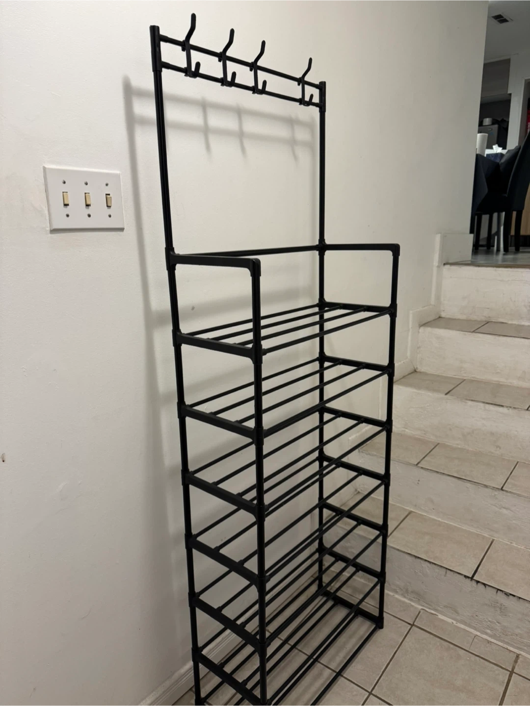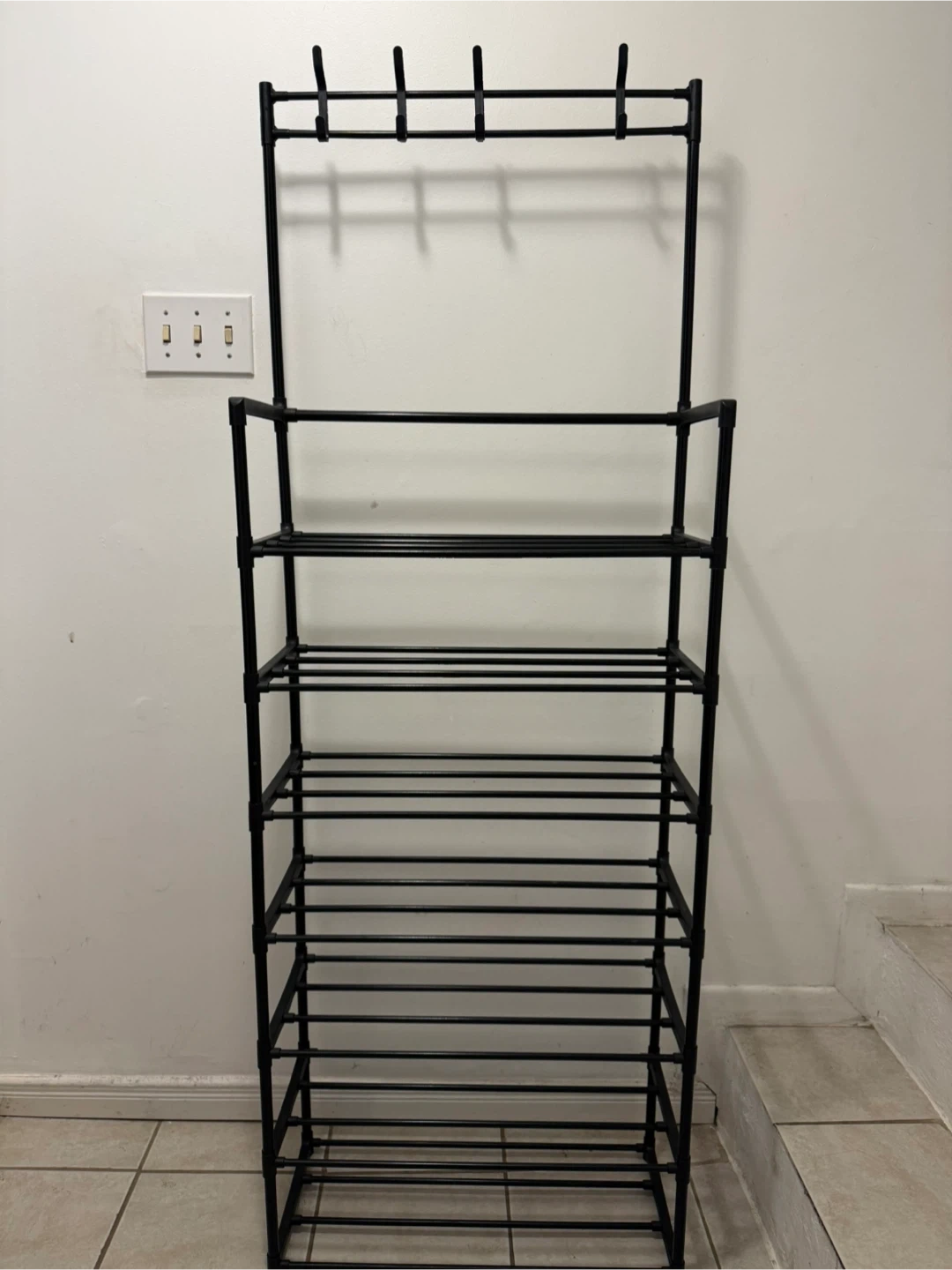 41Here's a handy black metal shoe rack, perfect for keeping your entryway organized! It features multiple shelves for shoes and a top rack with coat hooks for hanging jackets or bags. It's in great shape and ready to help declutter your space