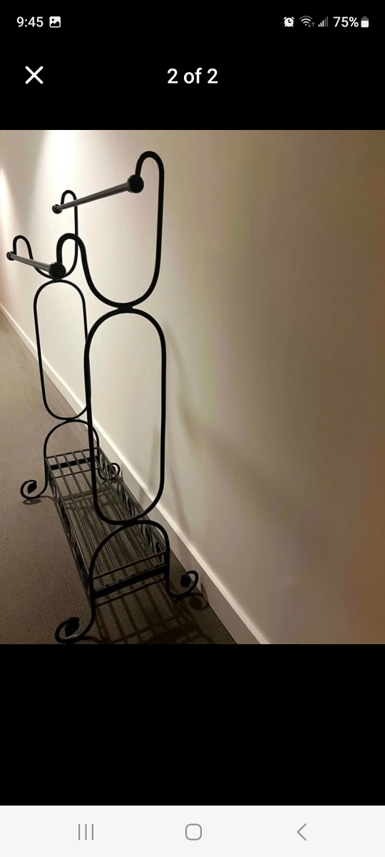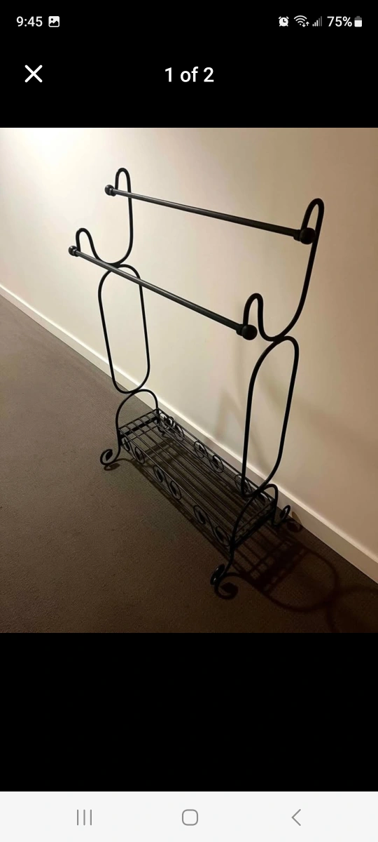 Here's a black metal towel rack that's perfect for adding a touch of elegance to your bathroom or laundry room! It has a sturdy design and is in great condition. It has two bars for hanging towels and a shelf at the bottom for extra storage