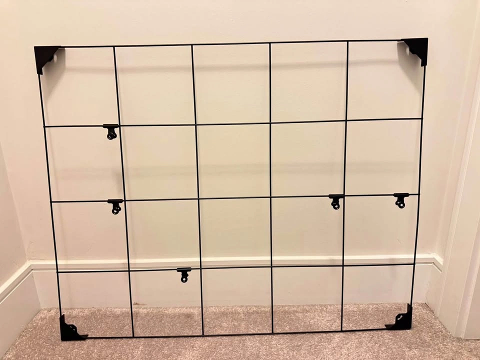 18Sleek black metal wall grid organizer with removable clips. Perfect for hanging photos, notes, jewelry, or lightweight décor. Minimalist and modern look — blends well with any room style. In great condition.