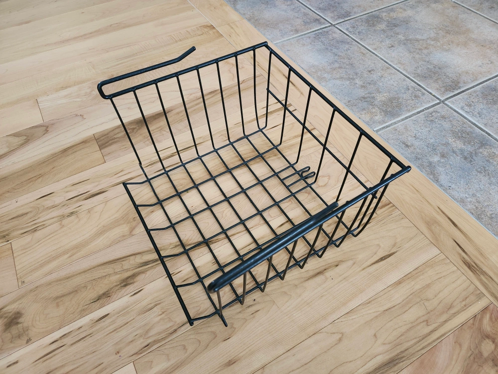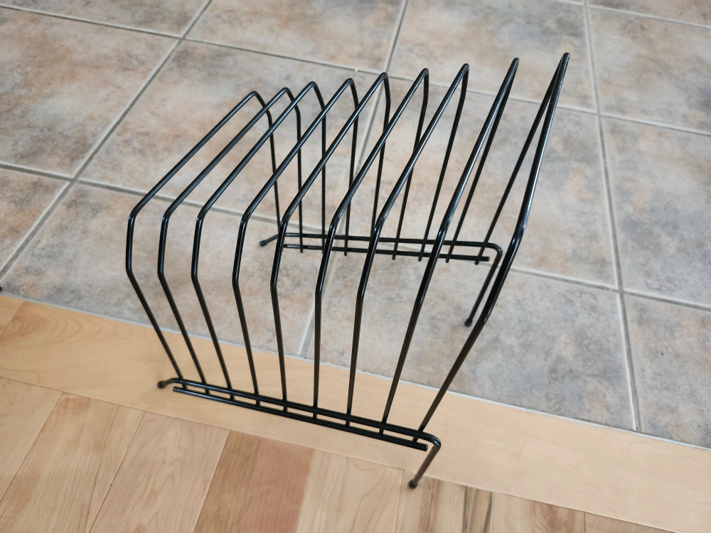 143Set of three black metal wire racks. Two are magazine/file rack, diner dishes rack and the other a small basket. Great for organizing. Simple design. Durable metal.