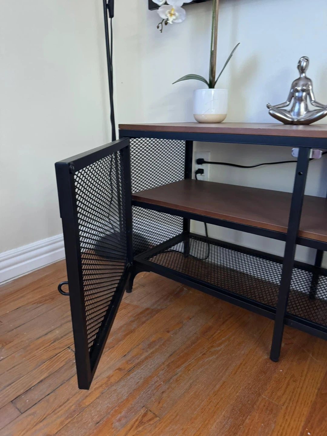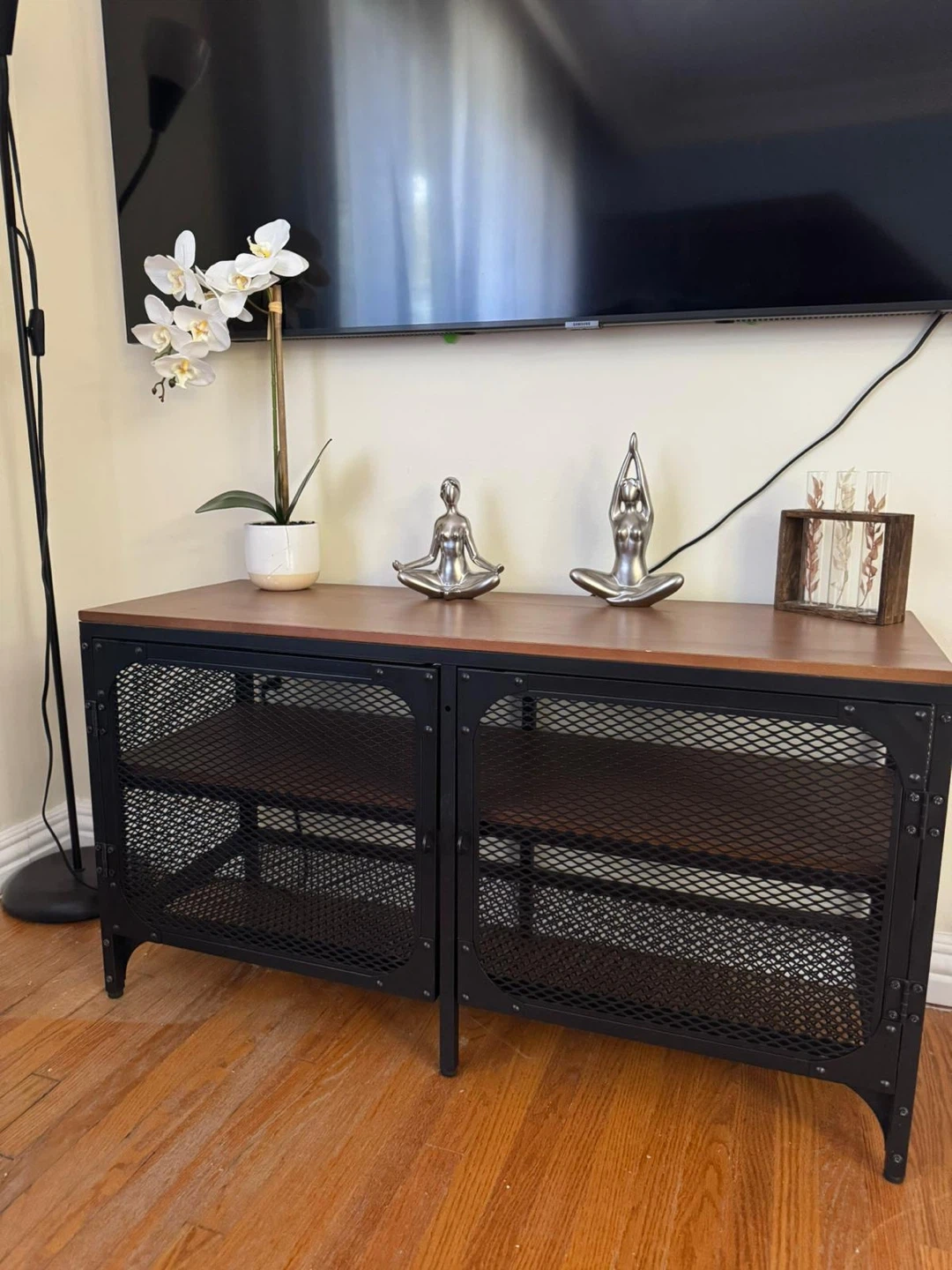 10IKEA FJÄLLBO TV Bench (150x36x54 cm) Industrial-style TV stand with metal mesh doors and wood top. This model is no longer available on the IKEA website, making it harder to find. Great chance to get a stylish and rare piece for your home!