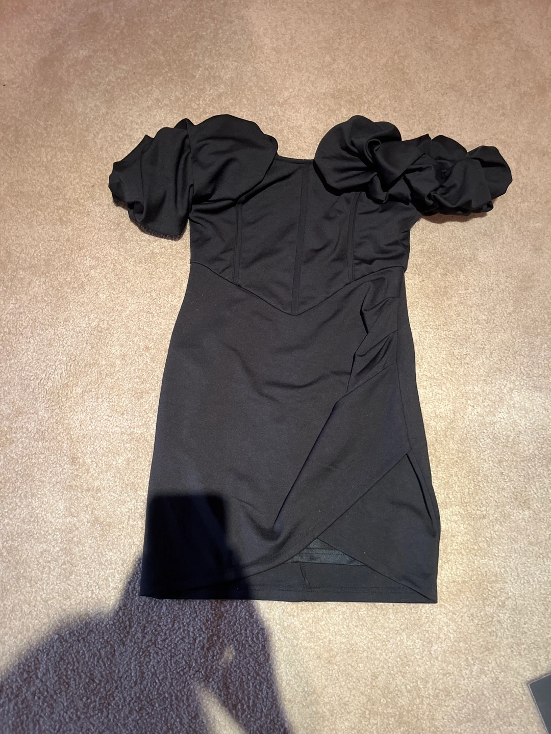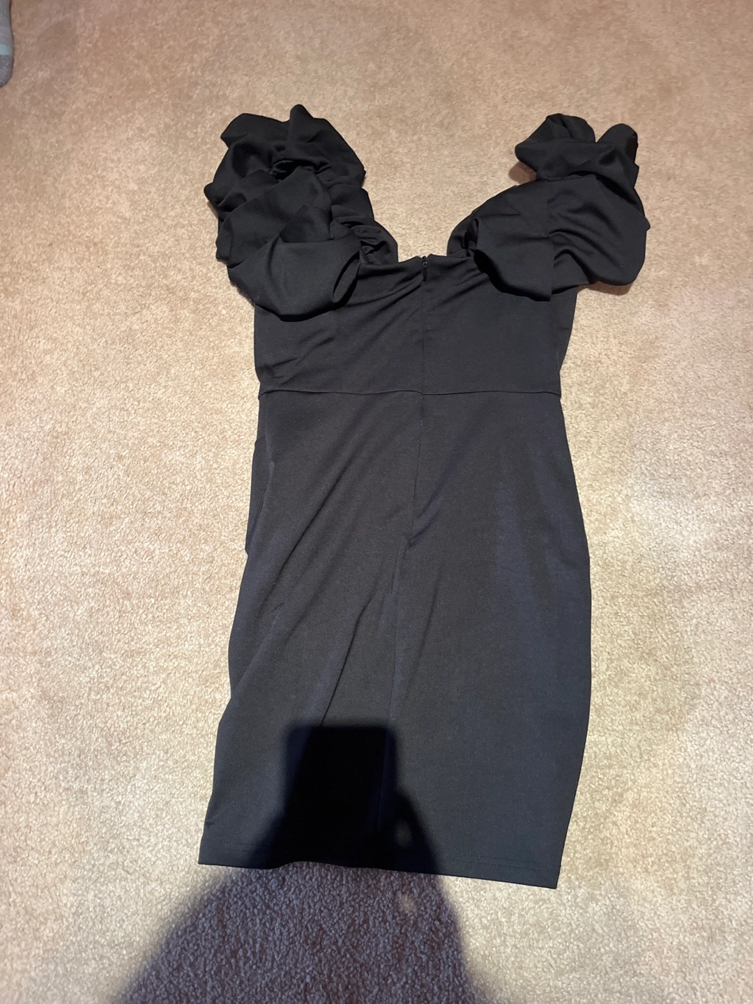 Cute black mini dress with unique puff sleeves! It's in great condition and ready for a new home. Perfect for a night out or a special occasion. The dress features a flattering silhouette and a stylish design. It's a versatile piece that can be dressed up or down