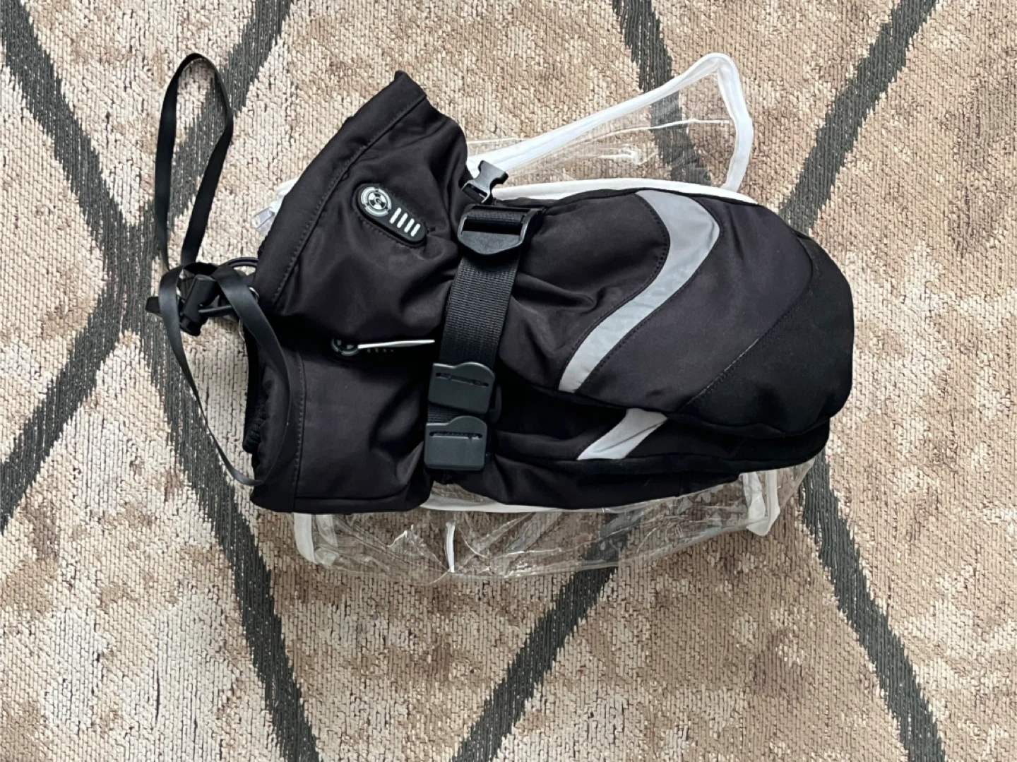 155Selling a pair of black mittens. They appear to be in good condition and come with a carrying strap and buckle.