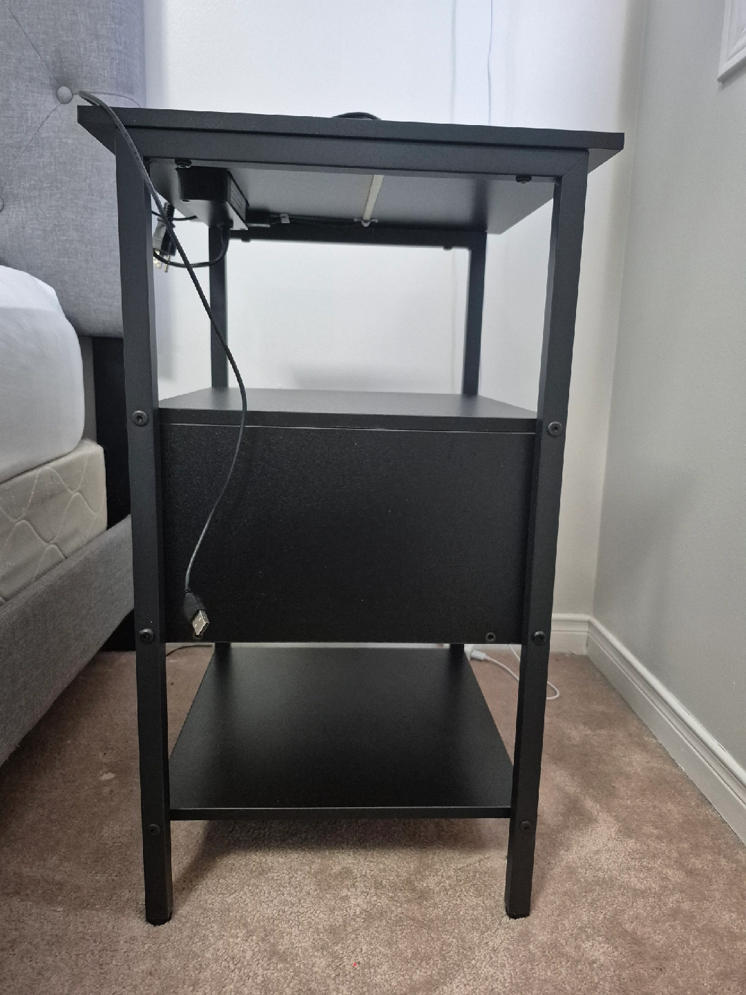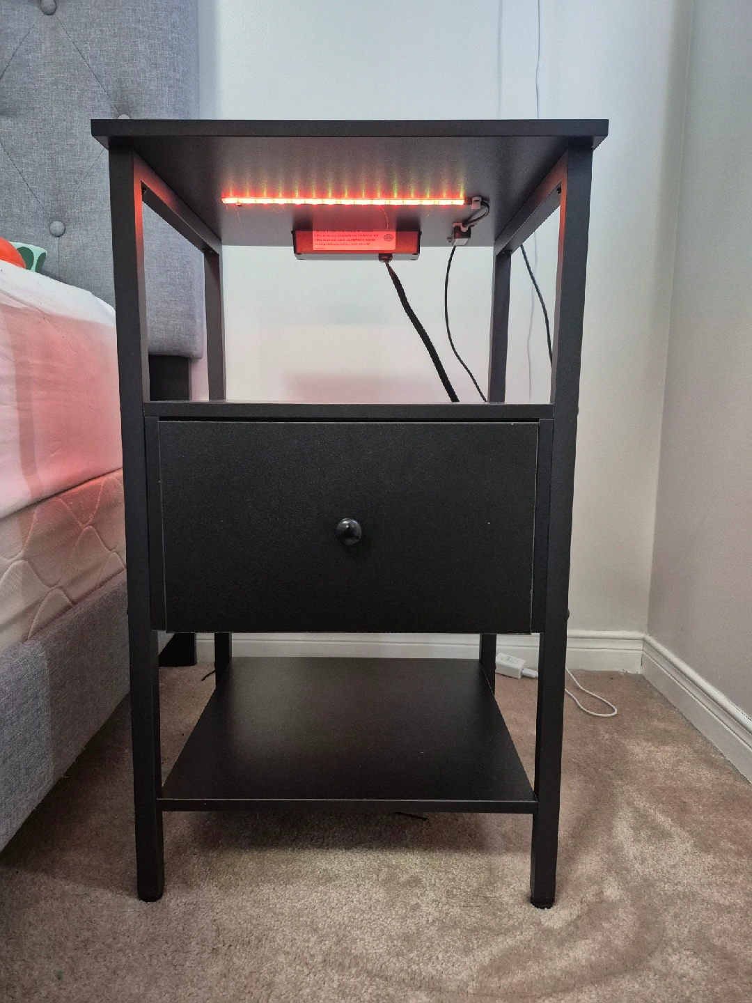 Looking to sell a set of handy black nightstand! It comes with a drawer, a shelf, and even has built-in LED lighting. Plus, there are USB ports and outlets on top, super convenient for charging your devices overnight.