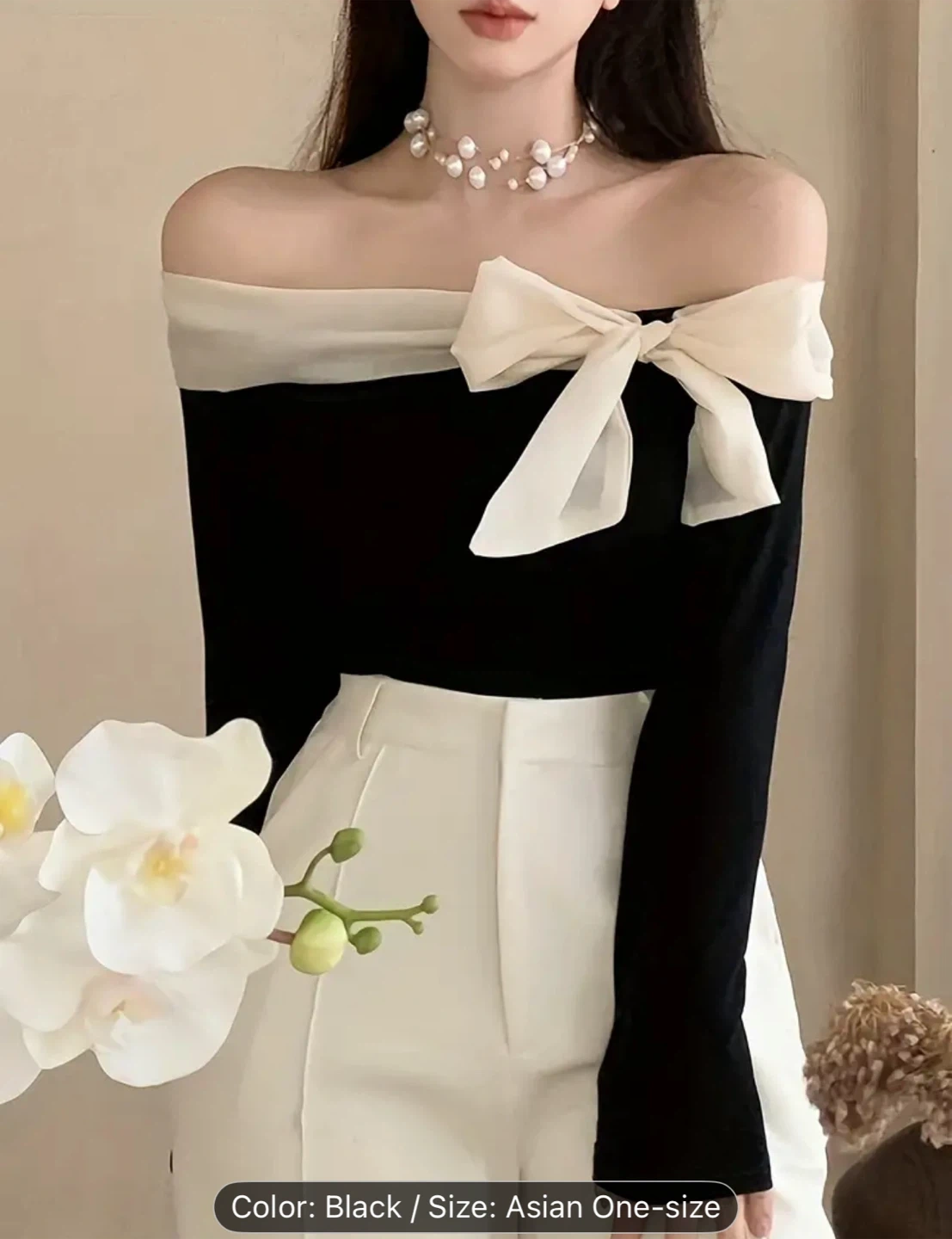 82Cute black off-shoulder top with a white bow detail. It's an Asian one-size, so please check the measurements to ensure a good fit! Perfect for a night out or a special occasion