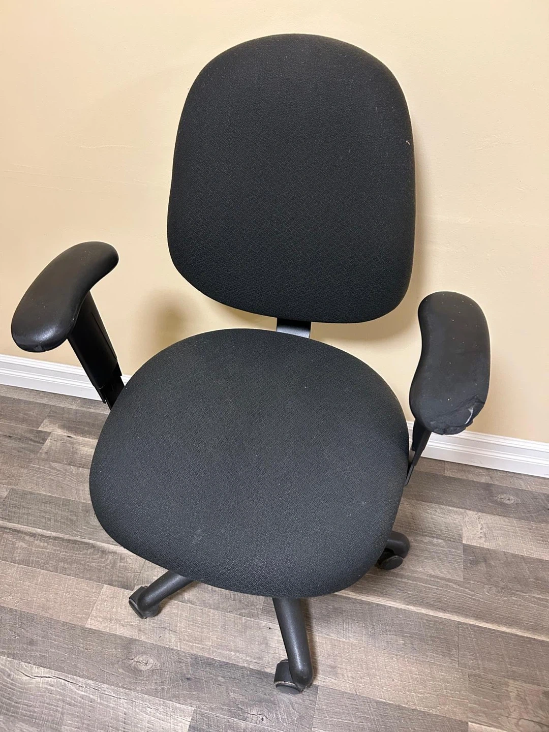 Selling a black office chair. It has a fabric seat and back, and adjustable armrests. There are some signs of wear on the armrests, but otherwise it's in good condition. Perfect for your home office or study space!