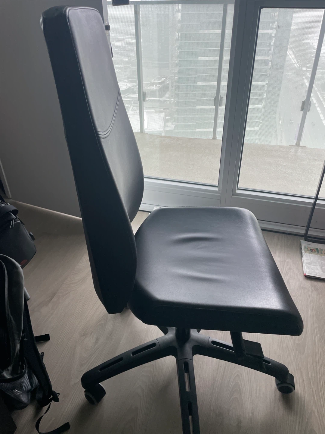 20IKEA leather chair. Selling a black office chair in good condition! It's perfect for your home office or study space. It has a comfortable seat and back, and it's easy to adjust the height. It has some signs of use.