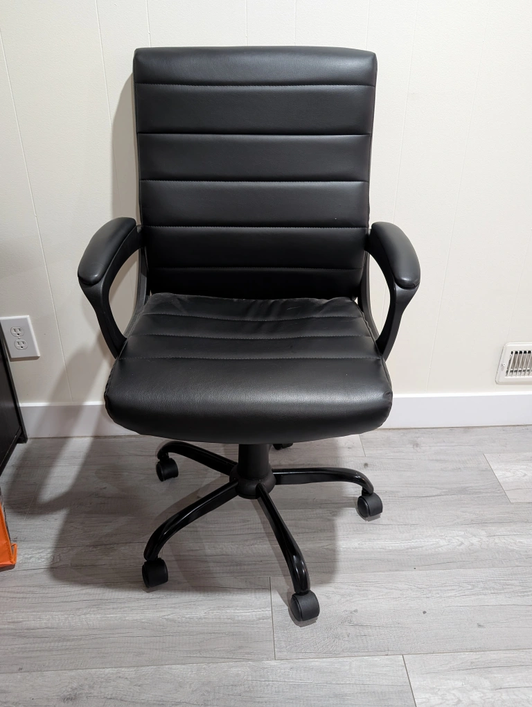 12Selling a comfortable black office chair! It's in good condition and perfect for working from home or studying. The chair features a padded seat and back for extra comfort, along with adjustable height and swivel function for easy movement