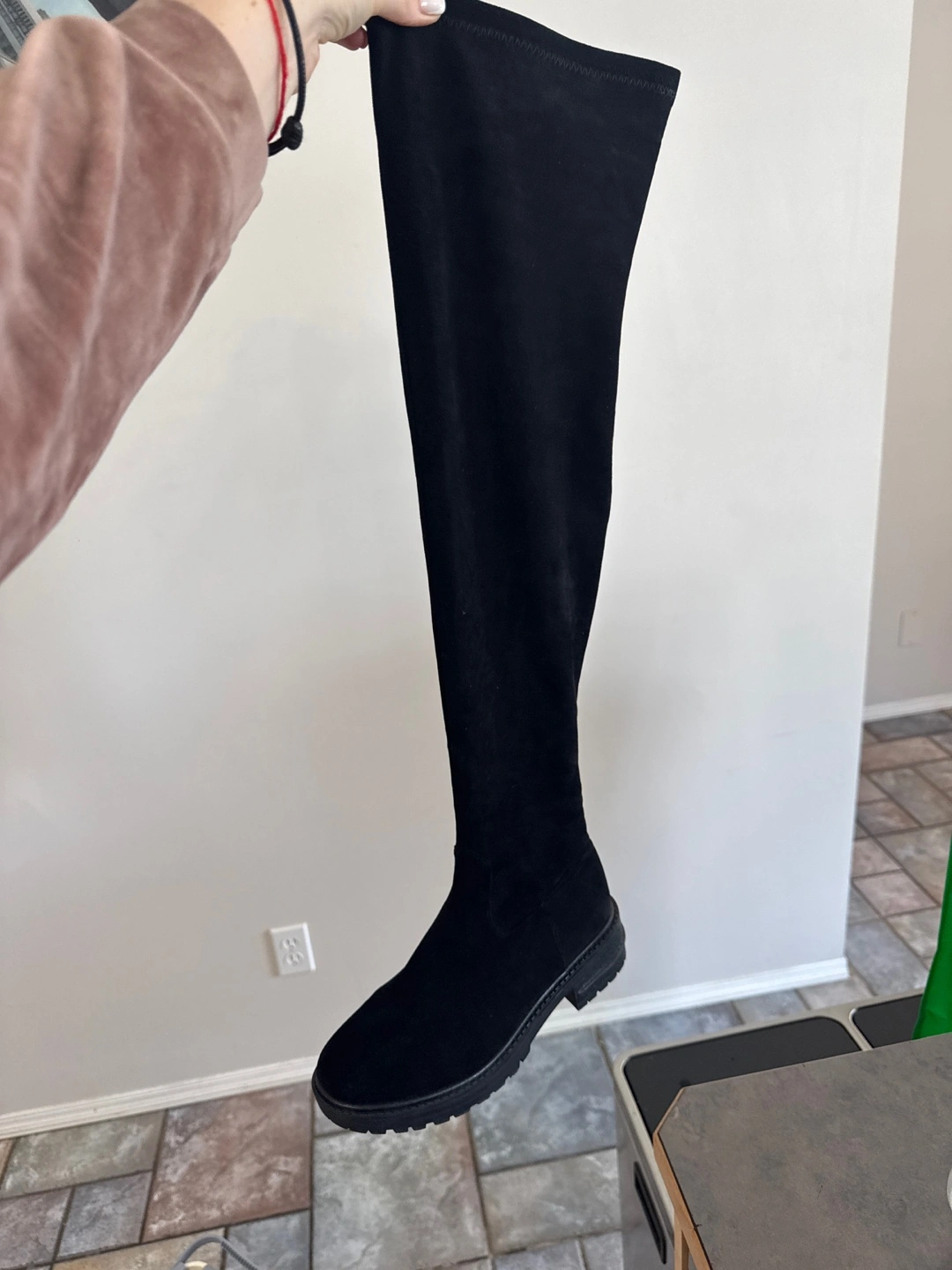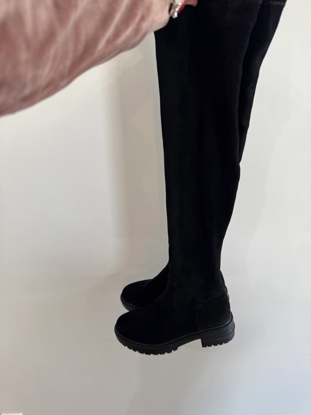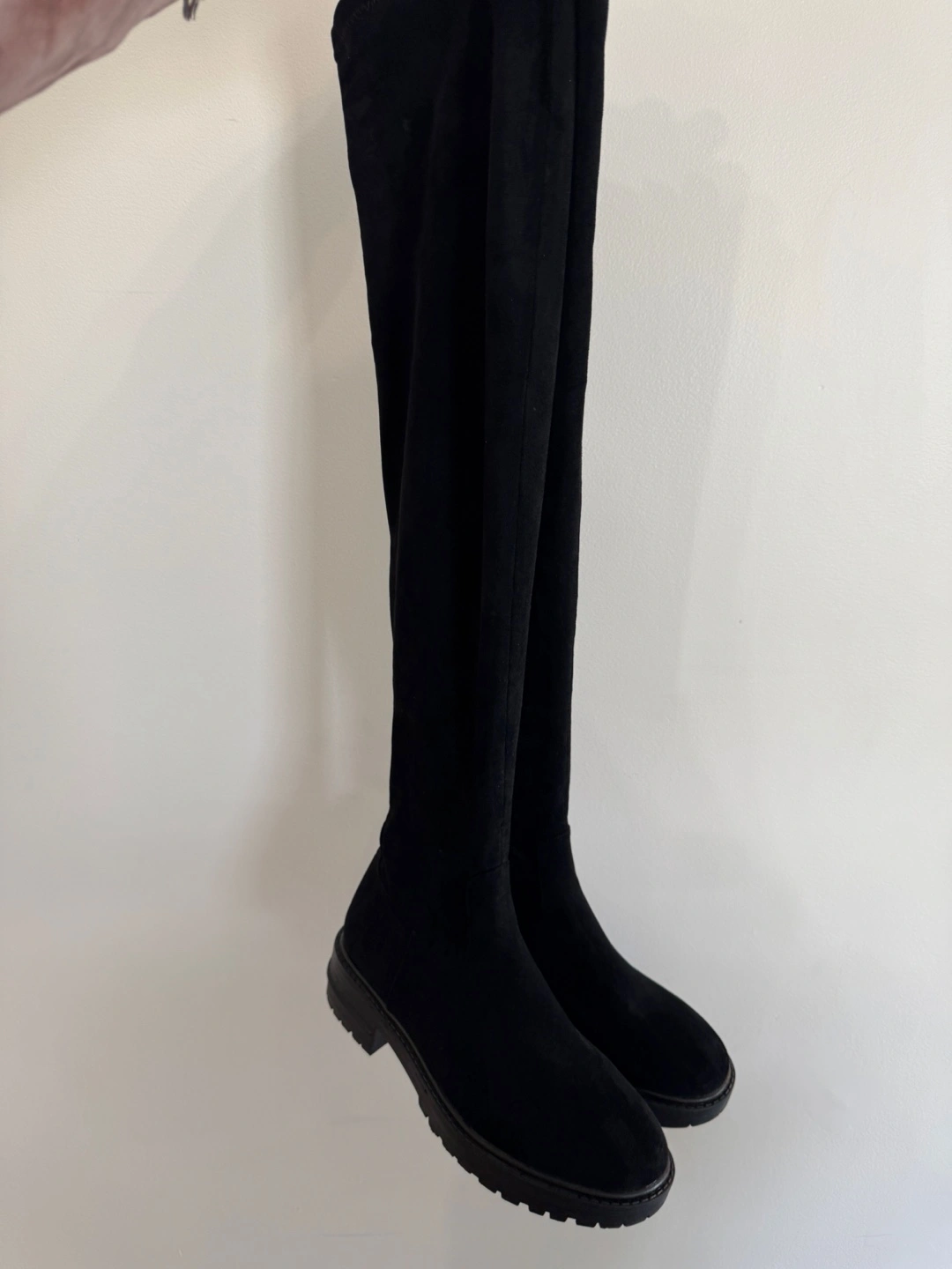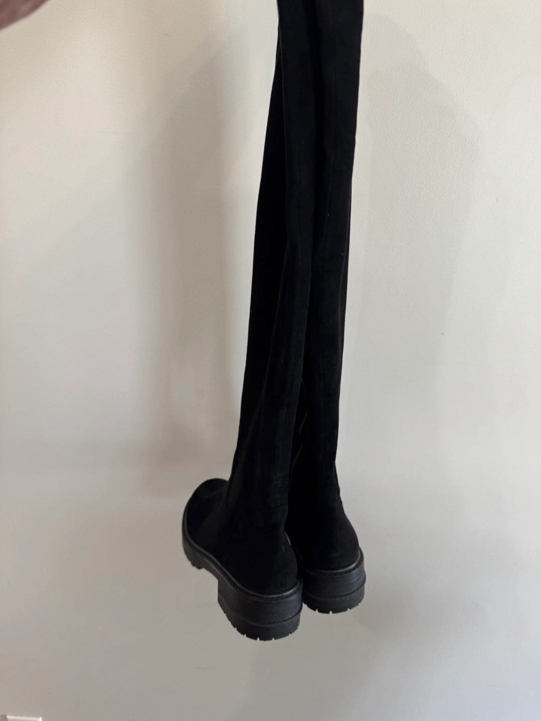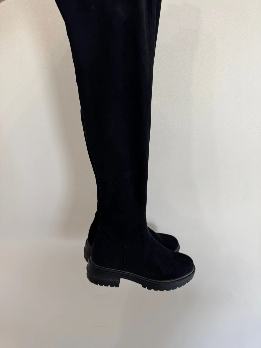 Pair of black over-the-knee boots. Suede-like material. Flat, chunky sole. Good for fall and winter.