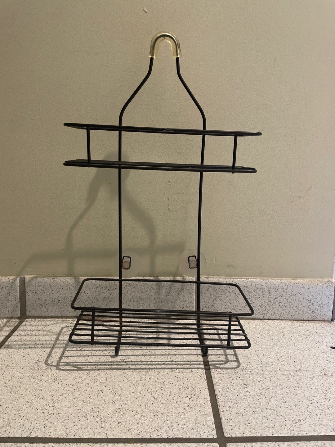 65Selling a black over-the-showerhead caddy. It has two shelves and a bottom hanging points. Great for organizing your shower essentials!