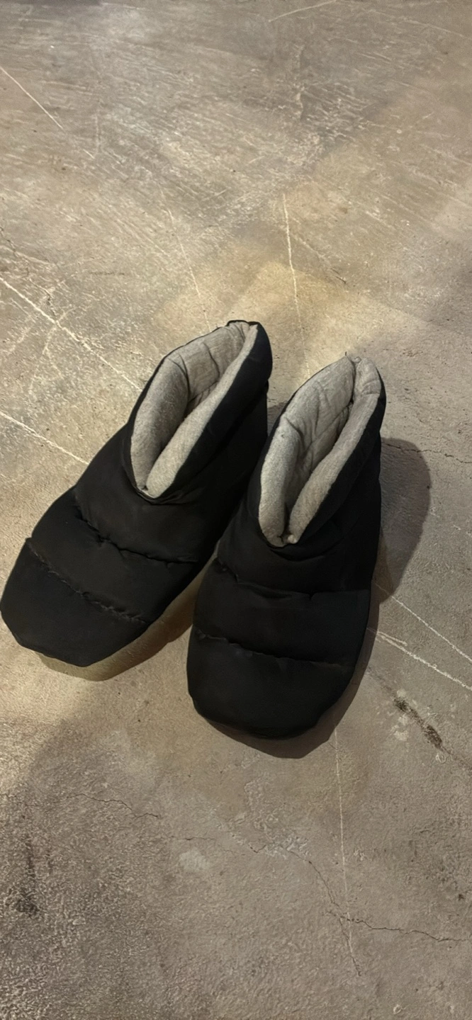 Cozy black padded slippers, perfect for keeping your feet warm on chilly days! They're in great shape and ready for a new home. These slippers are super comfy for wearing around the house.