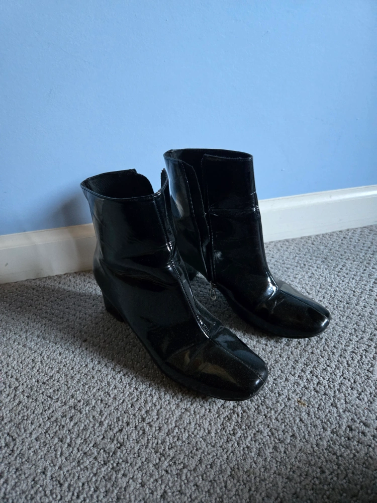 These are a stylish pair of black patent faux leather ankle boots. They feature a block heel and a zip closure on the side. The boots are in good used condition, showing some signs of wear on the soles as pictured, but the patent faux leather is still shiny and eye-catching