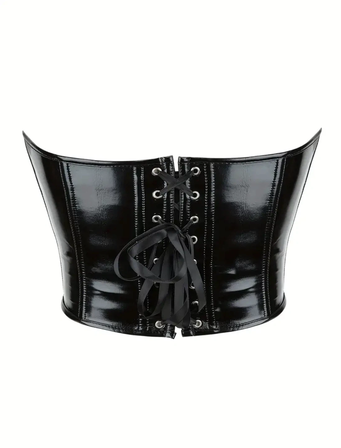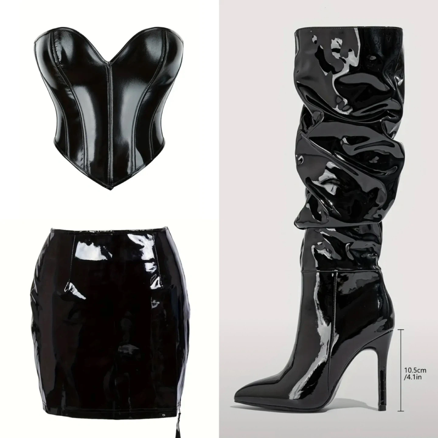 Selling a stylish set that includes a black patent leather corset, a matching skirt, and a pair of eye-catching boots. The boots have a heel height of approximately 10.5cm or 4.1 inches. This set is perfect for a night out or a special occasion!