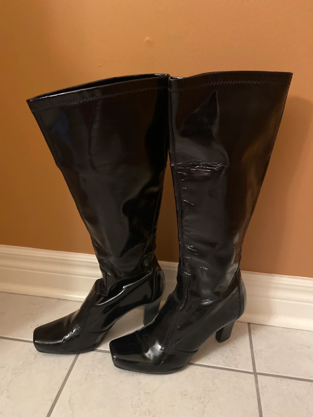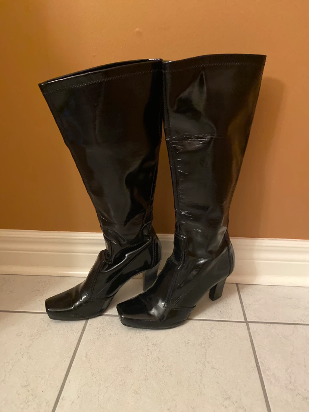 10Size 8 These knee-high boots are made of a shiny black patent leather material. They're in great shape and ready for a new home! Perfect for adding a bit of flair to any outfit