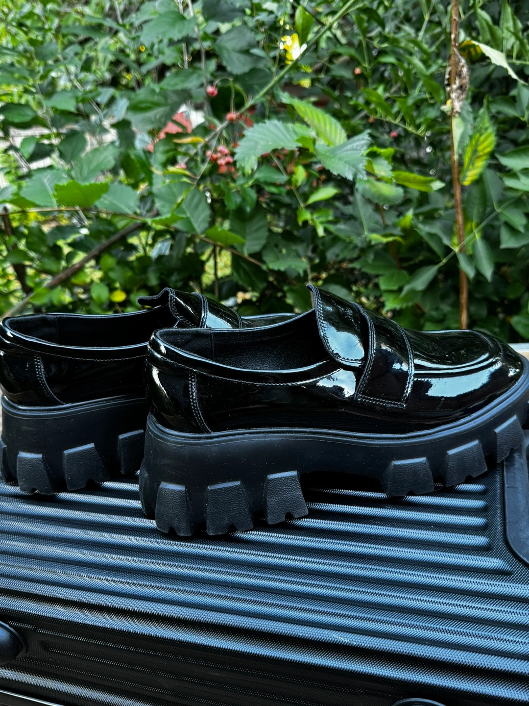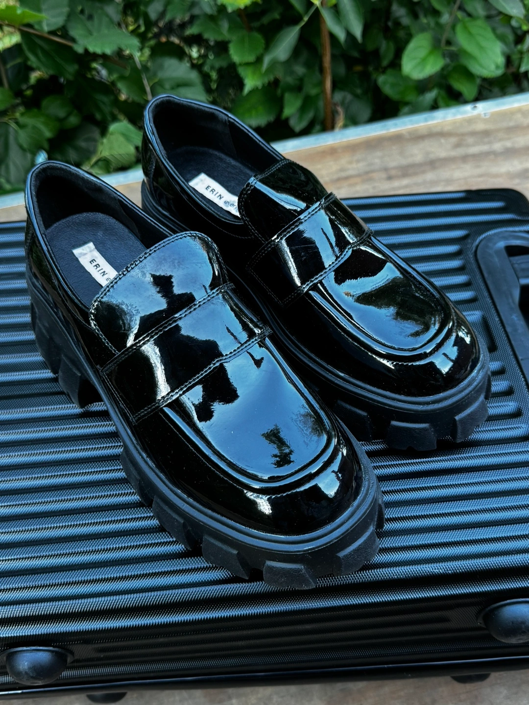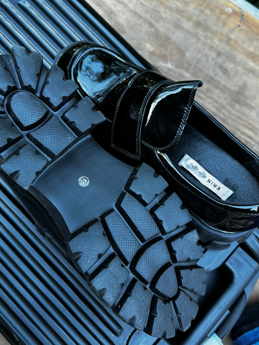30Women's black patent leather loafers with a chunky platform sole. RS: wrong size