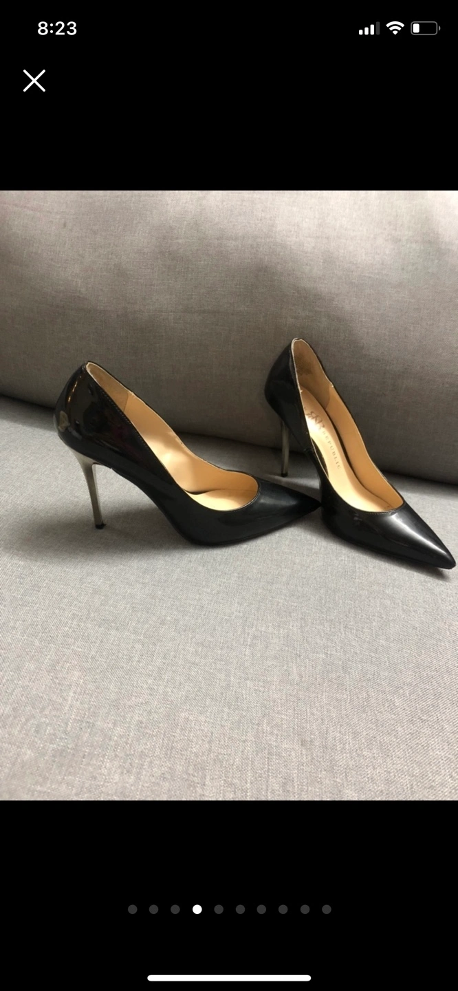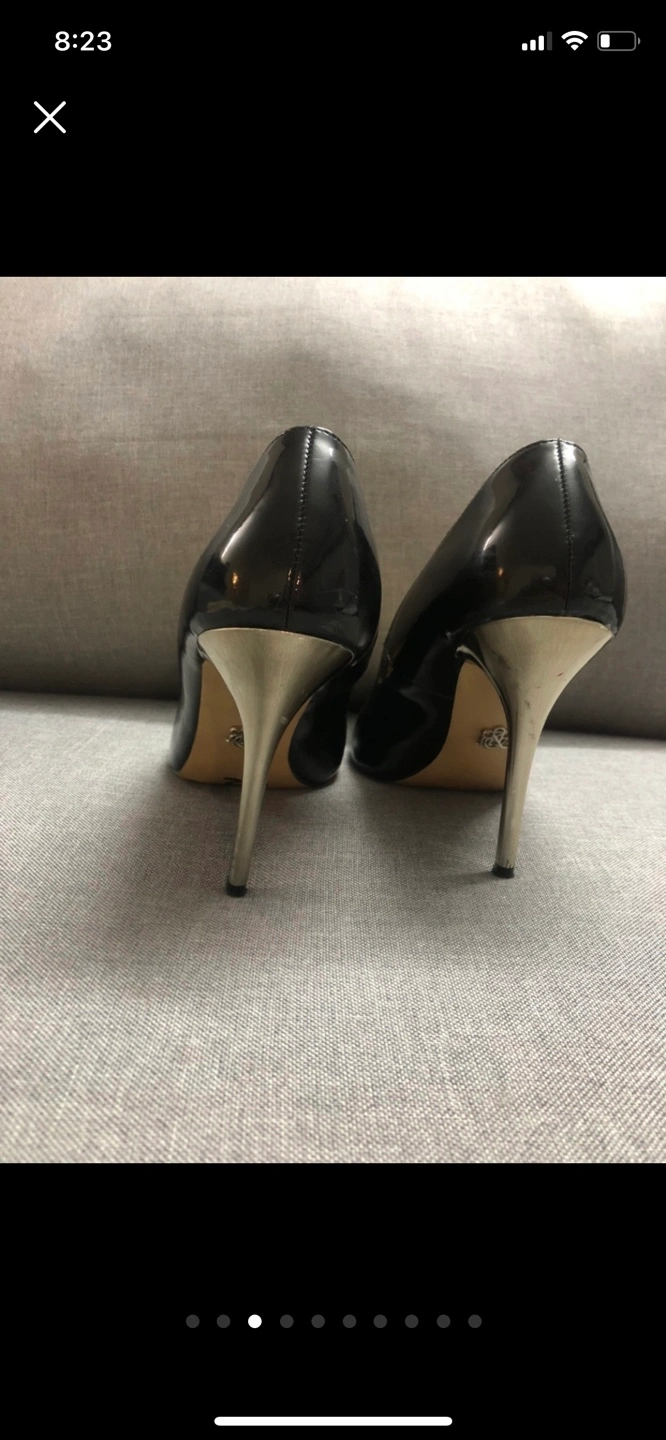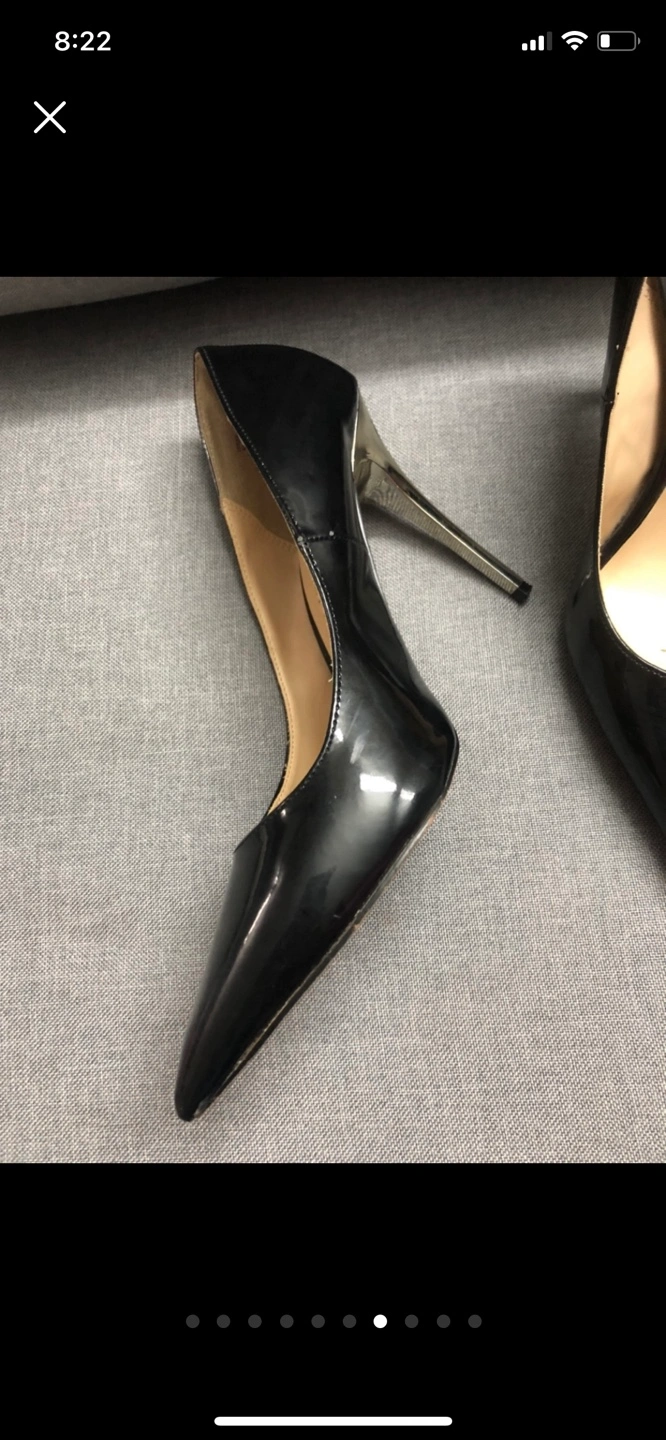47Elegant black patent leather high heels. Pointed toe. Silver accents on heels. Great for evening events or special occasions.