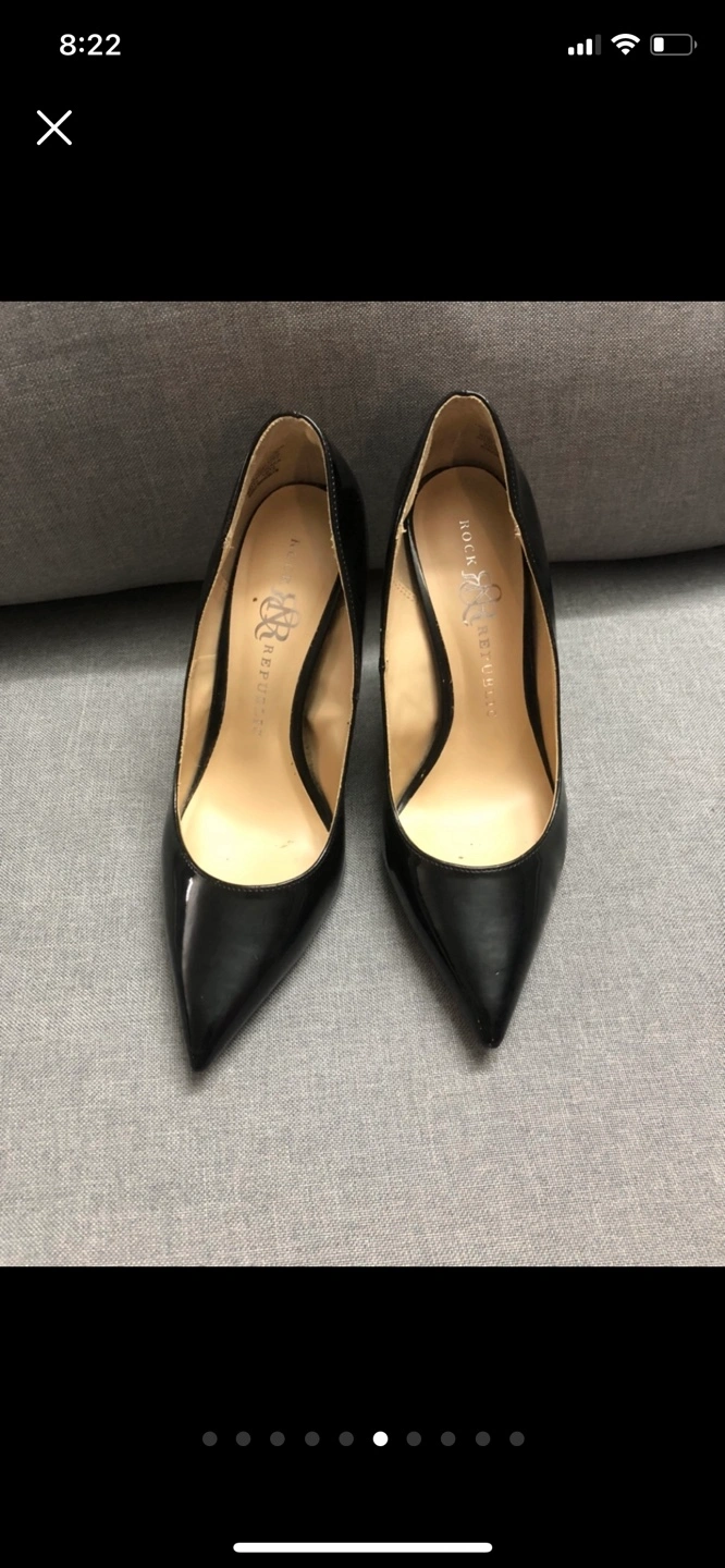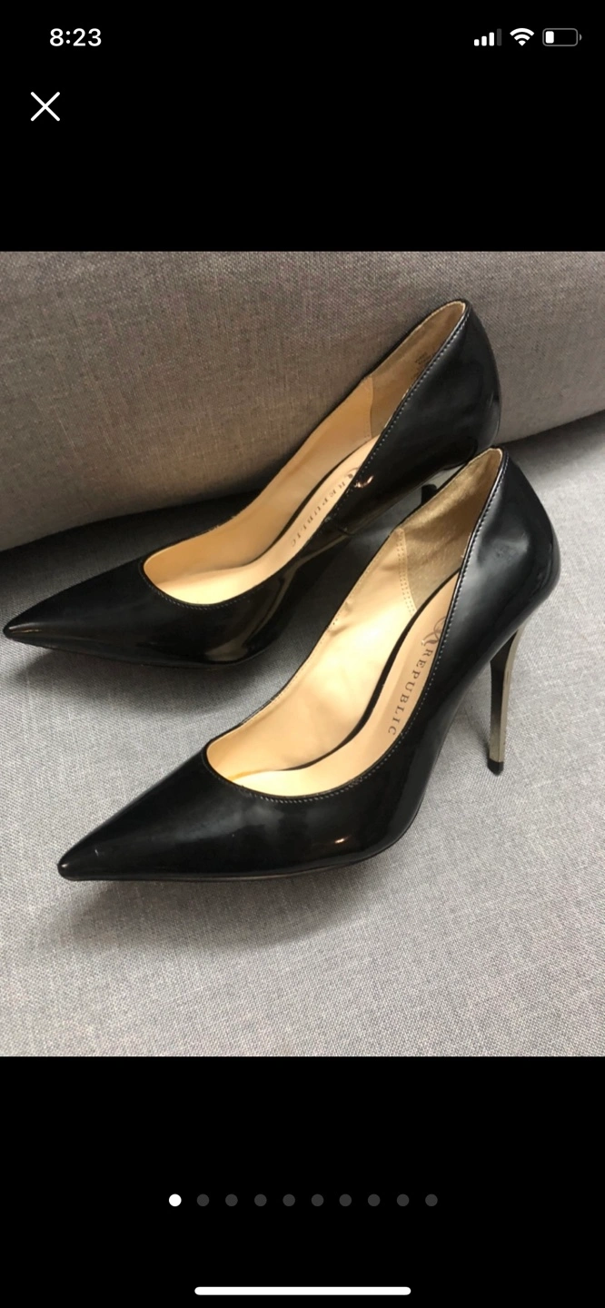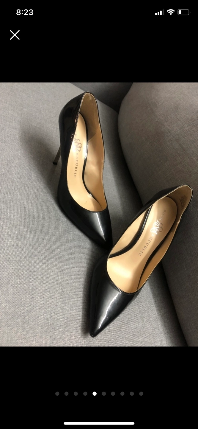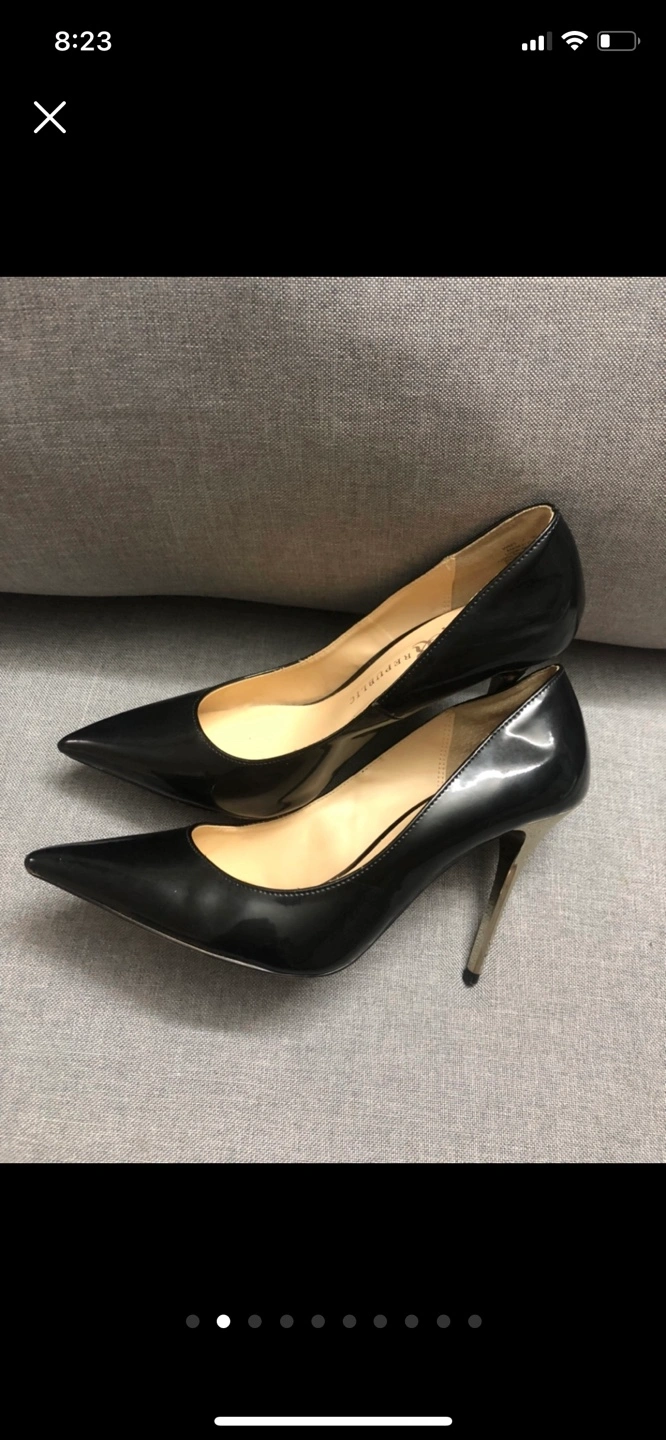 47Elegant black patent leather high heels. Pointed toe. Silver accents on heels. Great for evening events or special occasions.