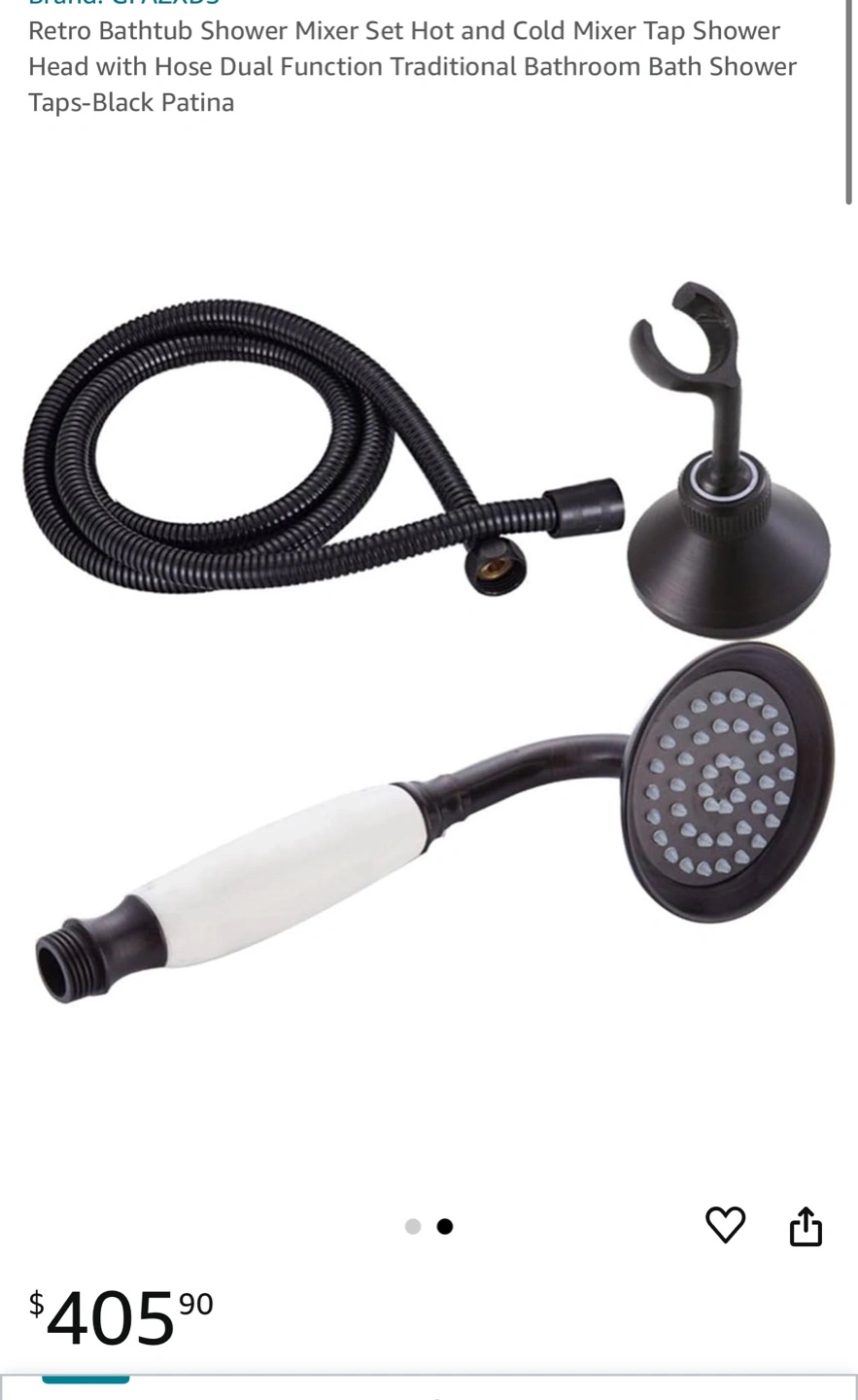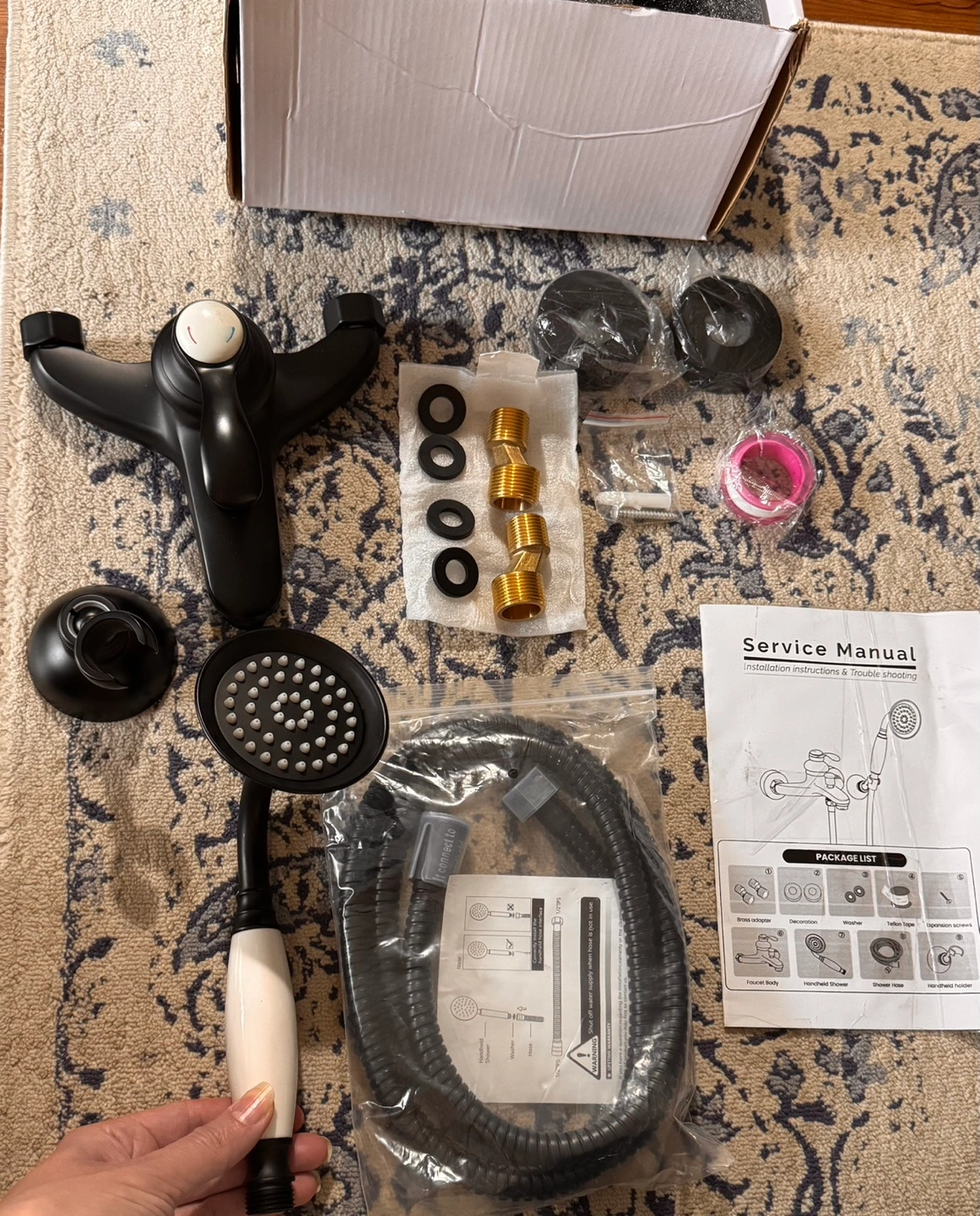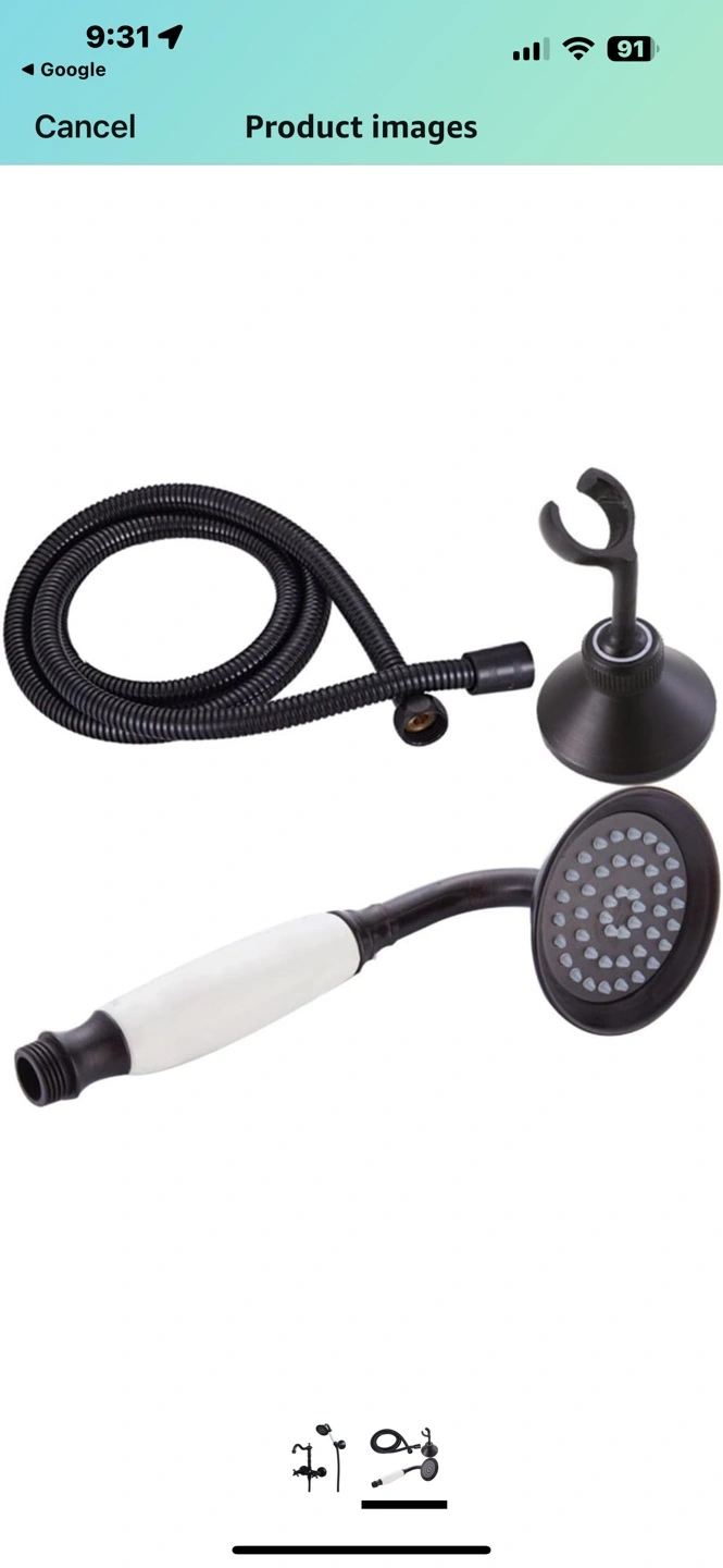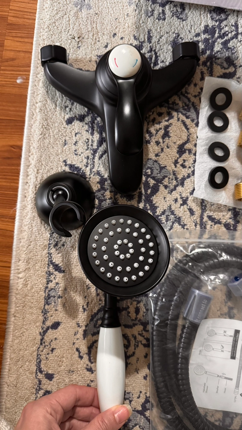 92Brand new in box. Includes shower head, hand shower, hose, and all mounting hardware. Oil rubbed bronze finish. Traditional style.