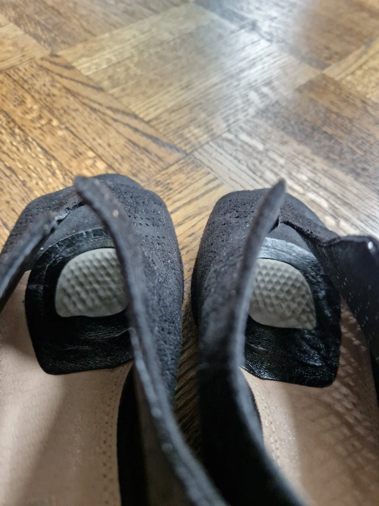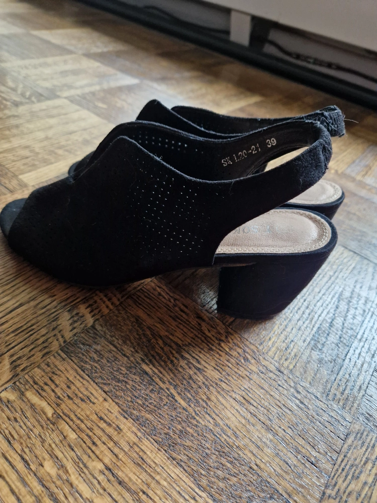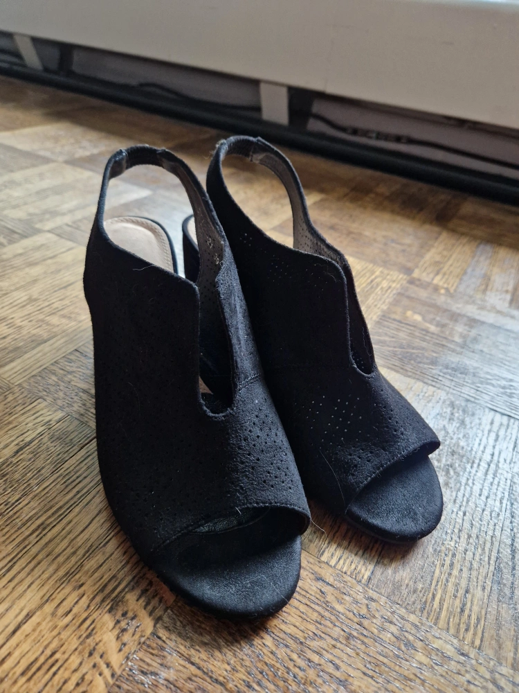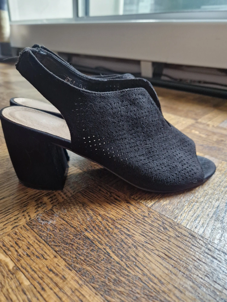 15Selling a pair of black peep toe heels. They're in good condition and ready for a new home! They have a slingback strap. There are two metatarsal pads for more comfortable wearing.