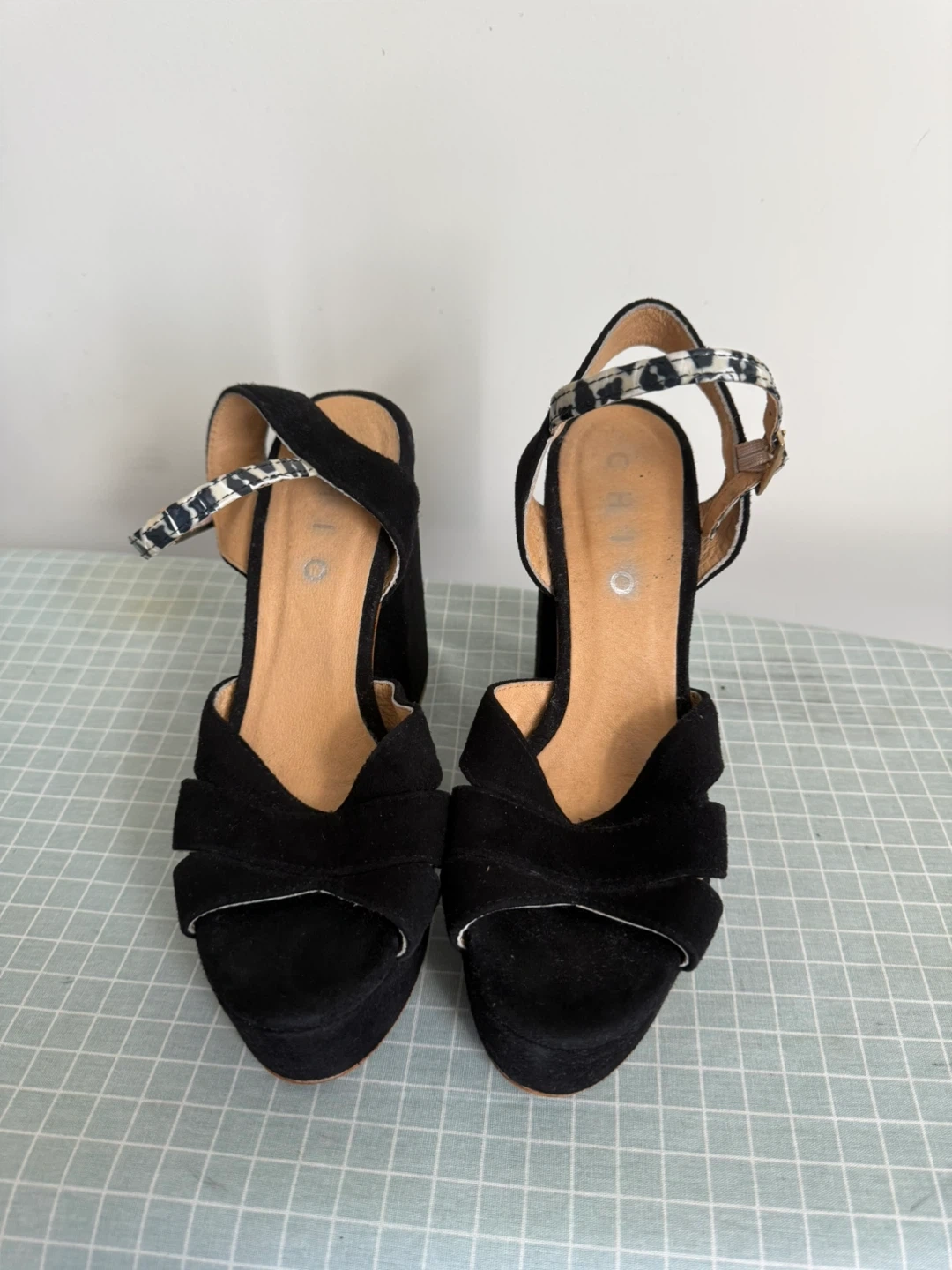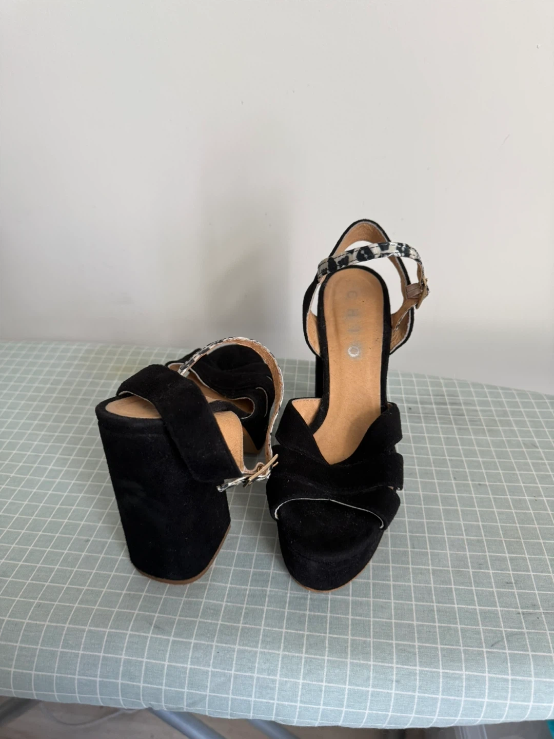 These platform heels are ready for a new home! They are a women's size 7 and feature a stylish black suede with a block heel and an ankle strap with a fun animal print detail. The soles show some signs of wear, but the shoes are still in great condition for strutting your stuff