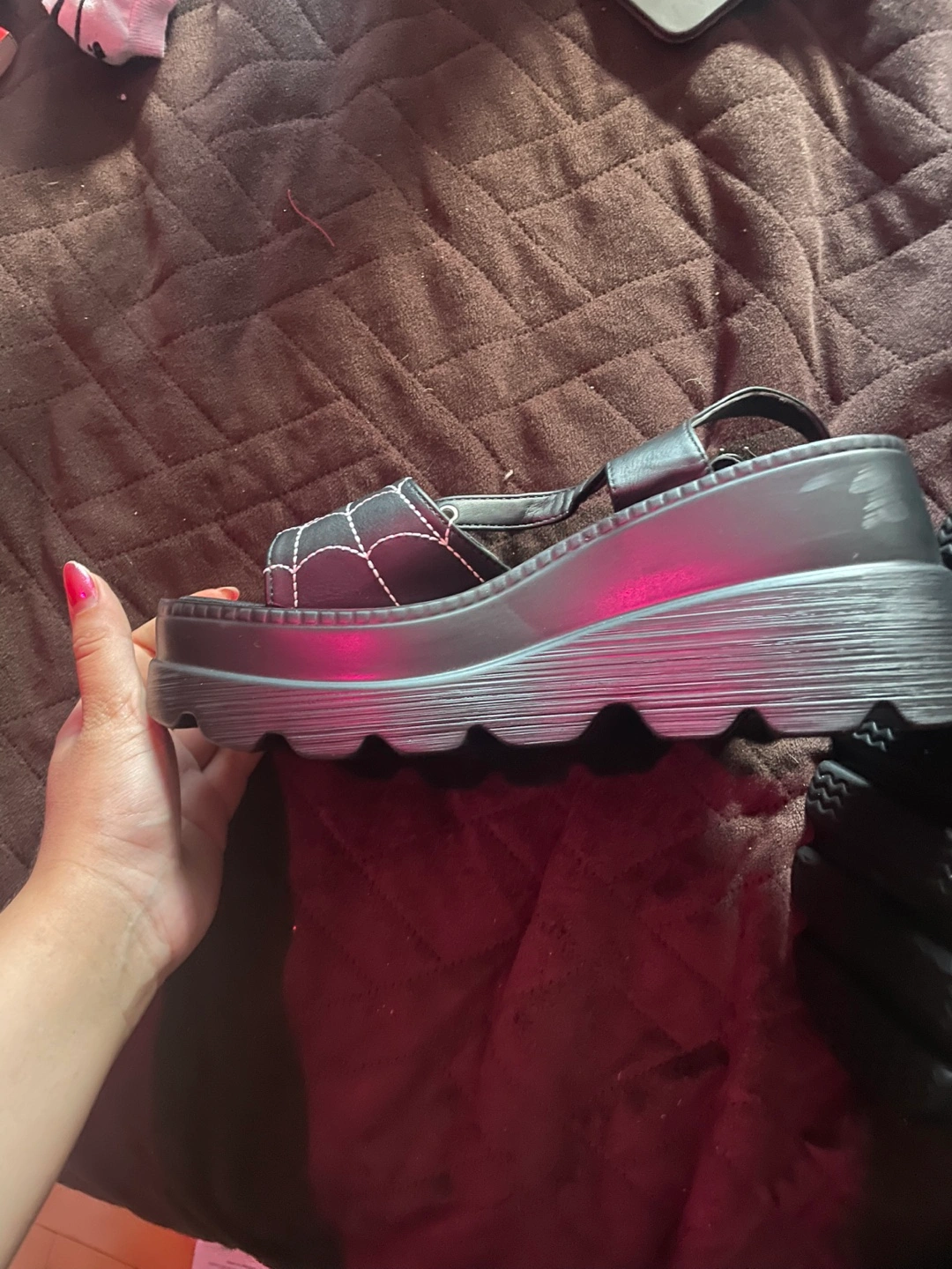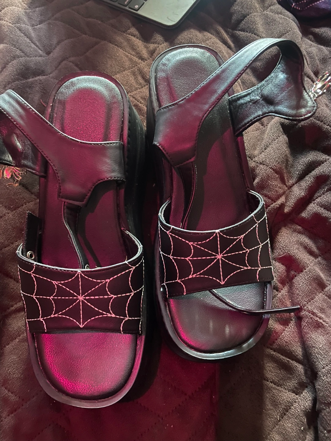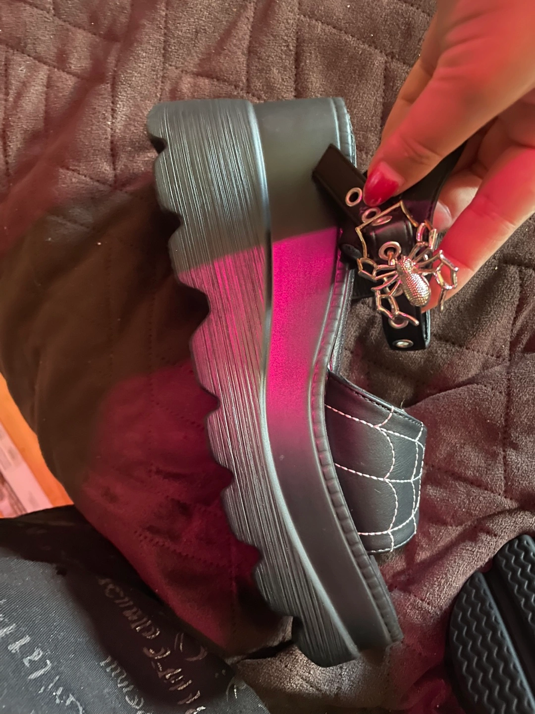 These black platform sandals feature a unique spider web design on the front. They have a chunky platform sole and an ankle strap with a cute spider charm. Accidentally ordered the wrong size. Just looking to get some of my money back. Never worn.