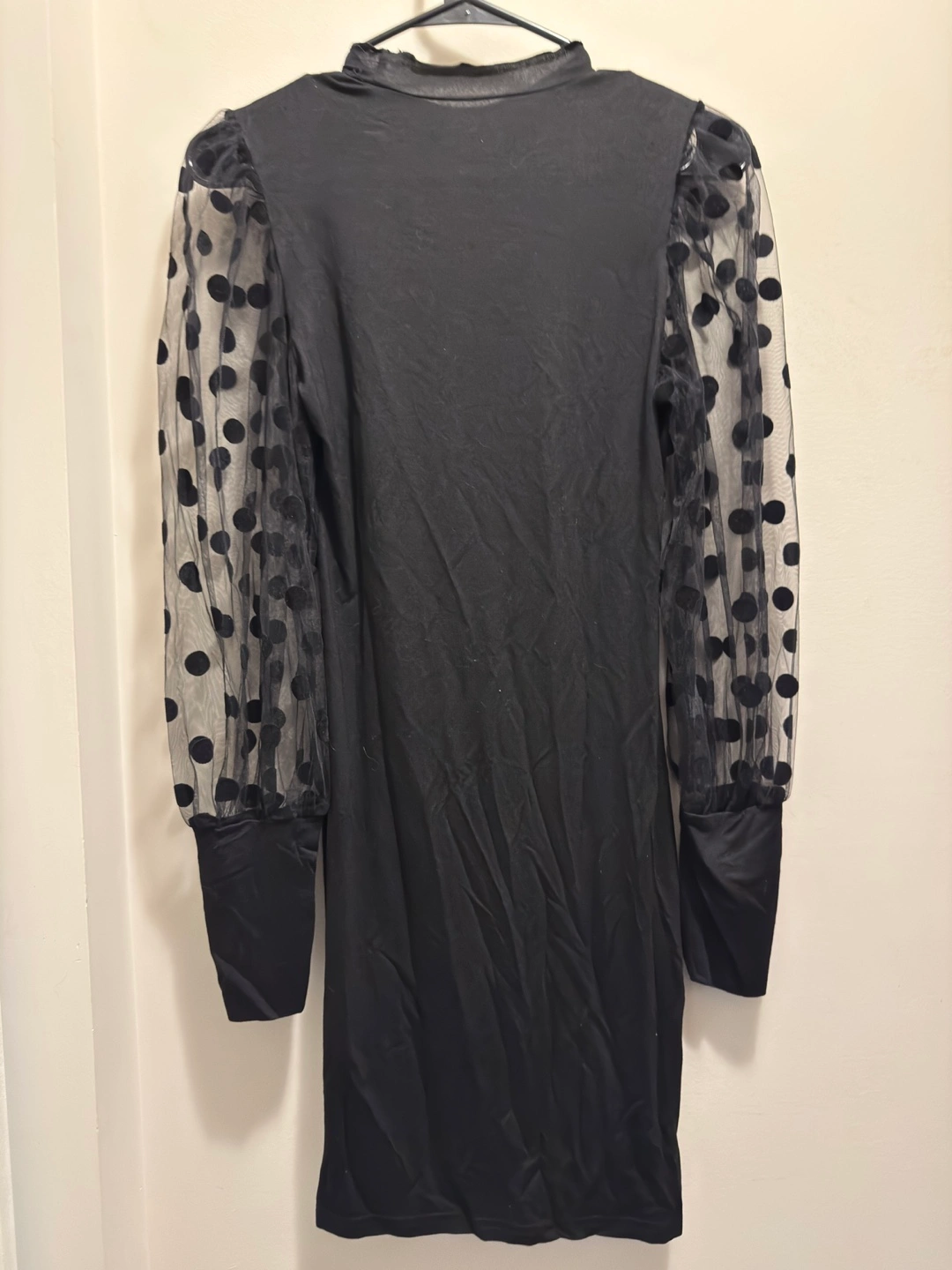 Never worn —-This is a cute black dress with polka dot sleeves! It's in great condition and would be a lovely addition to your wardrobe