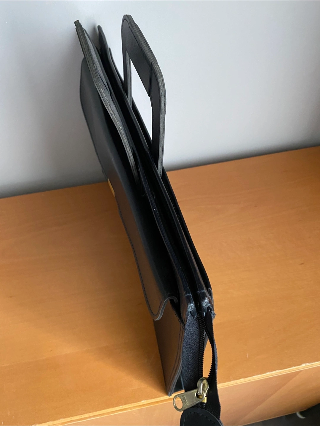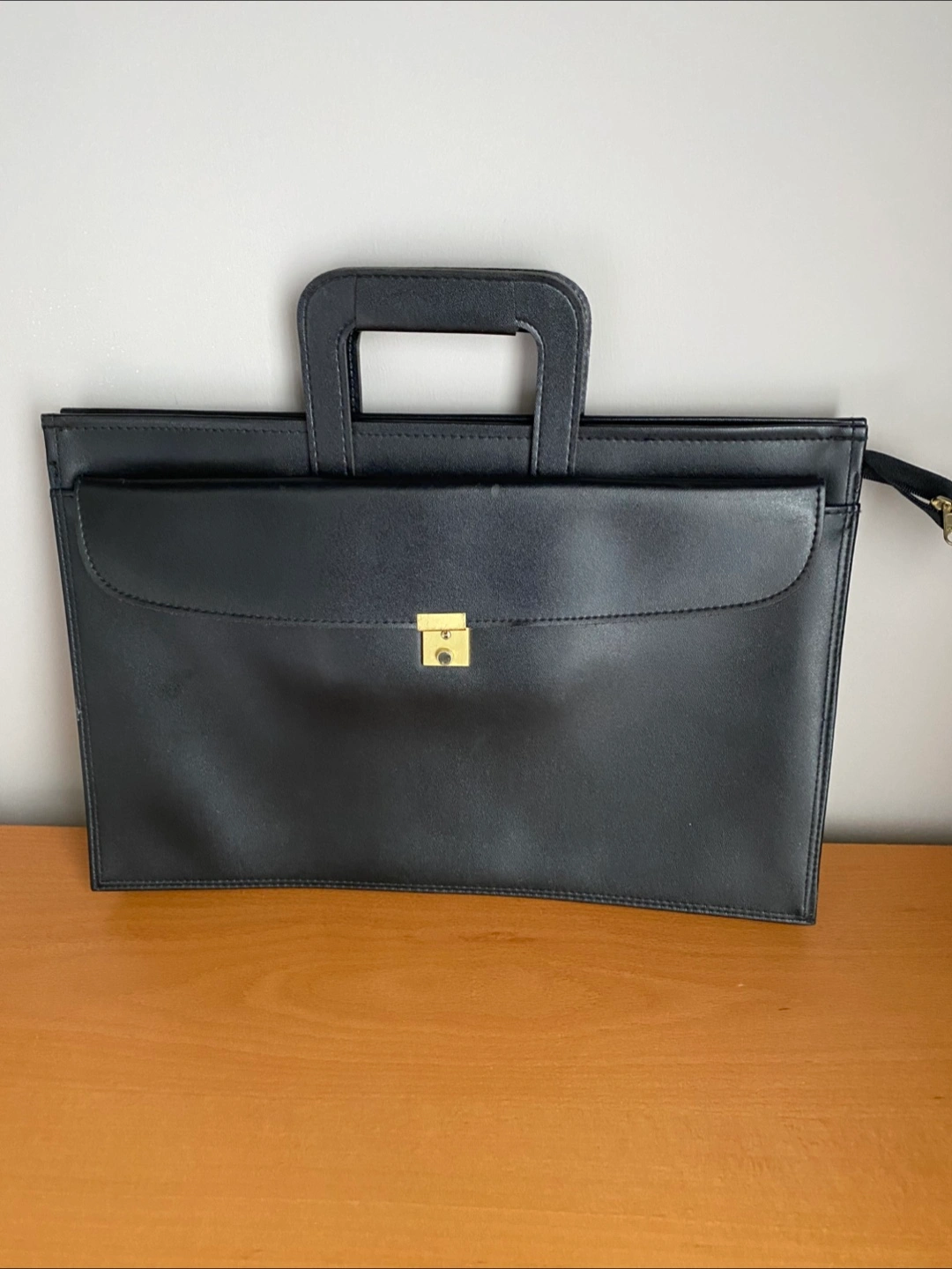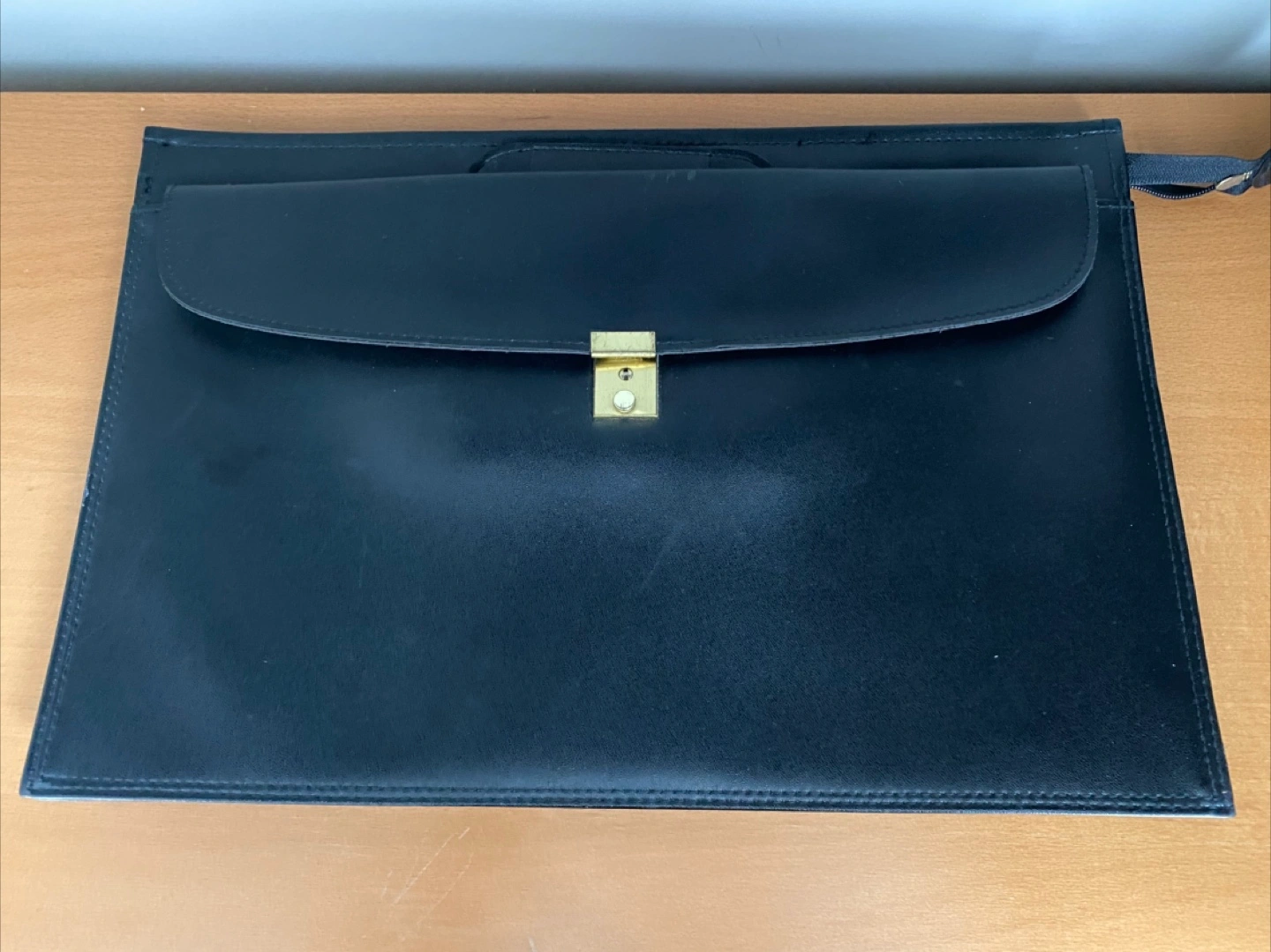 36Selling a black portfolio bag, perfect for carrying documents and essentials. It has a collapsible handle. Great for work or school.
