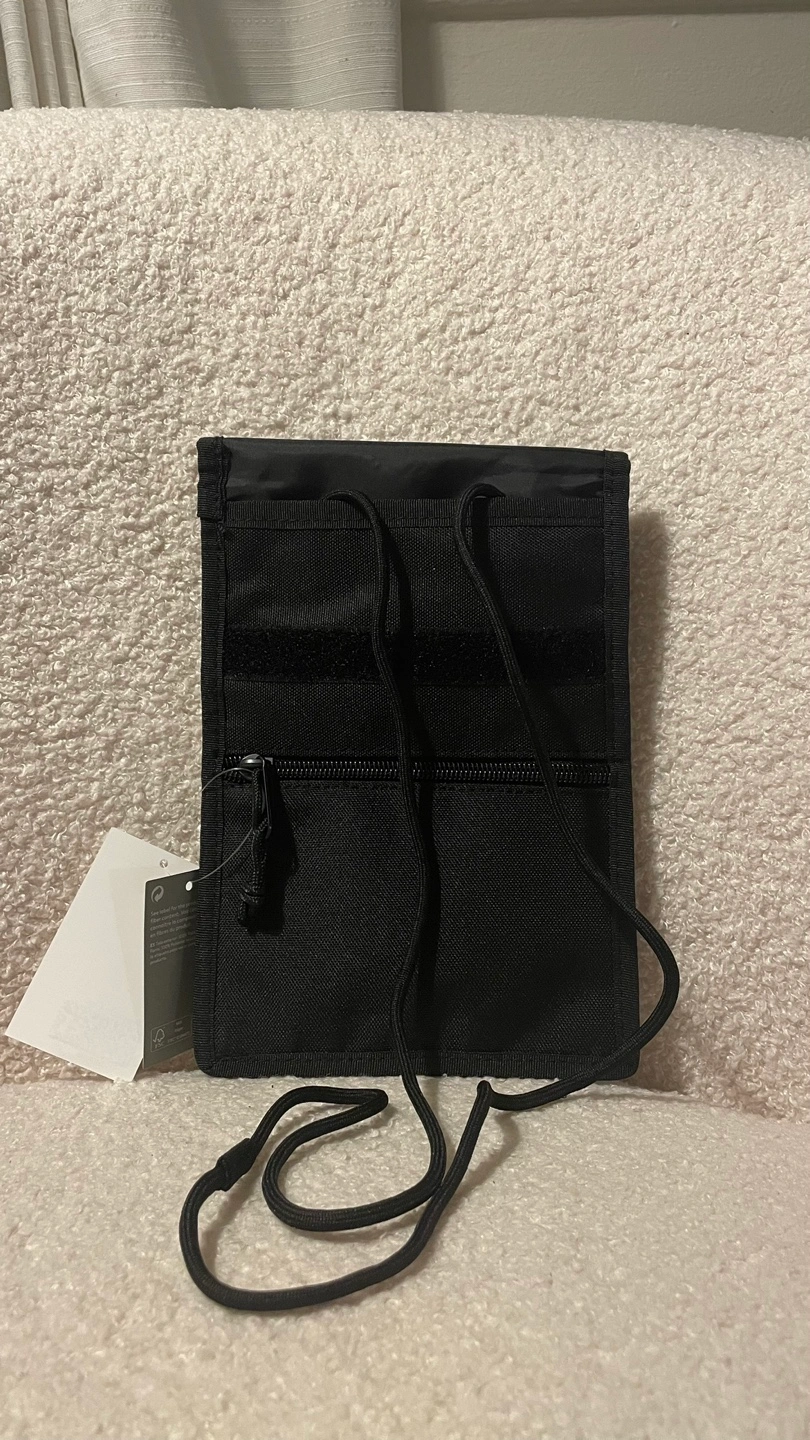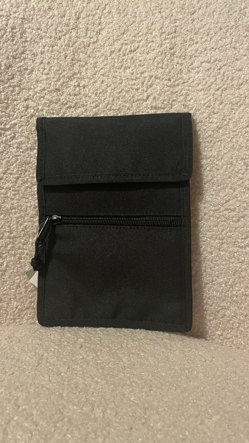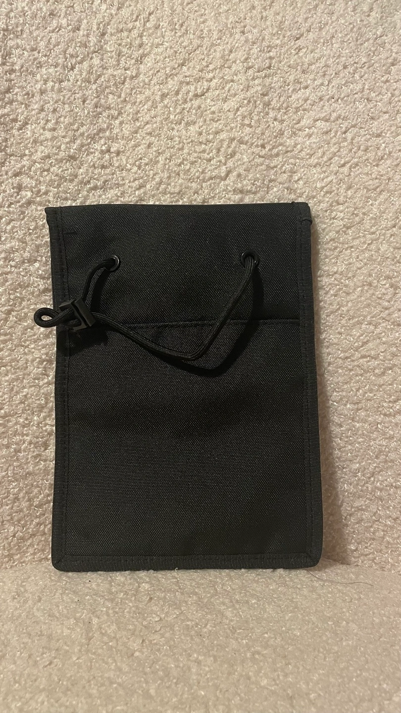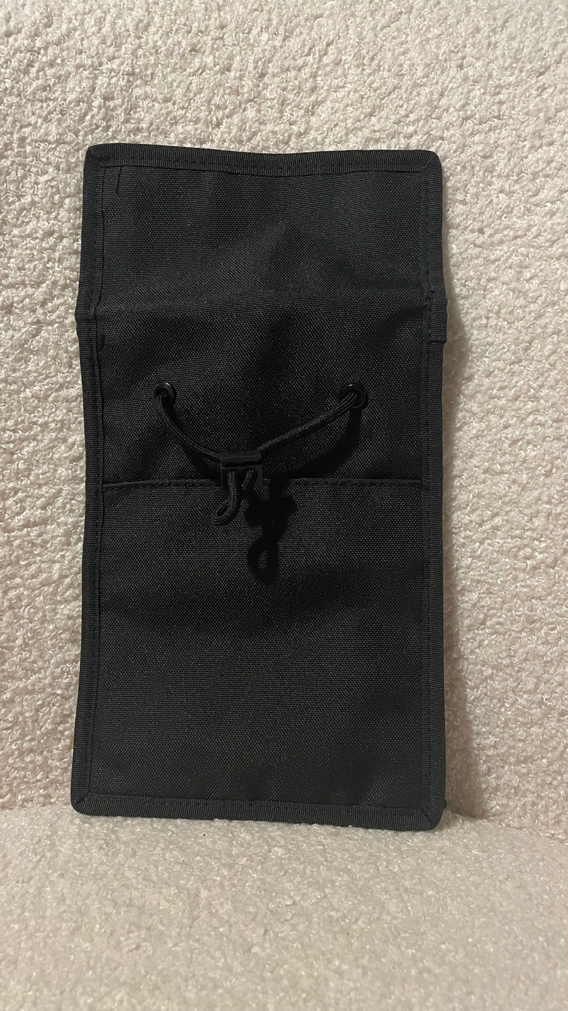 82Selling a black pouch. It has a zipper and a drawstring closure. It appears to be in new condition.