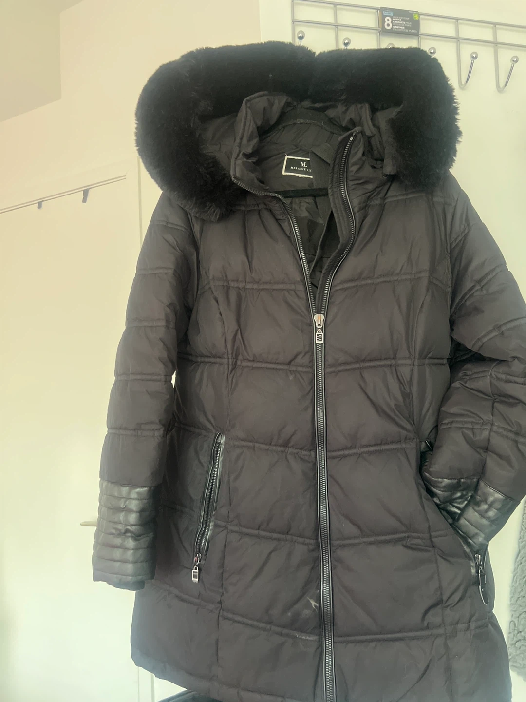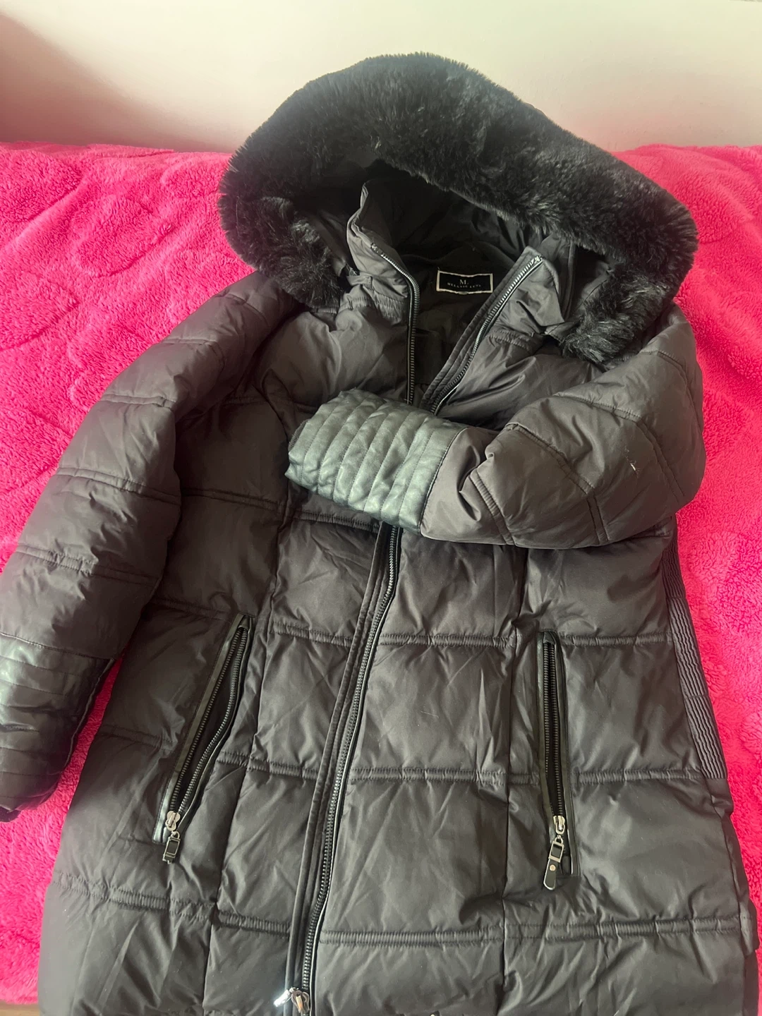15A stylish black puffer coat from Wilfred Free is up for grabs! It features a faux fur-trimmed hood and quilted detailing on the sleeves. Perfect for staying warm and fashionable during the colder months!