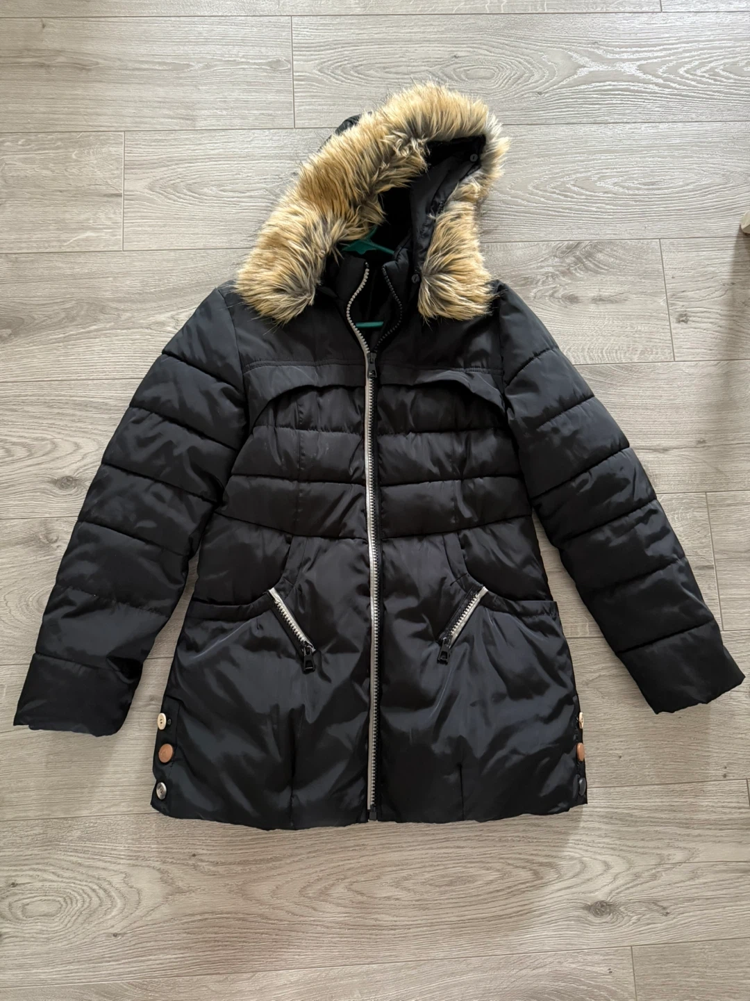 15Selling a stylish black puffer jacket, perfect for staying warm during the colder months! It features a faux fur hood for extra coziness and a sleek design. It's in great condition and ready for a new home