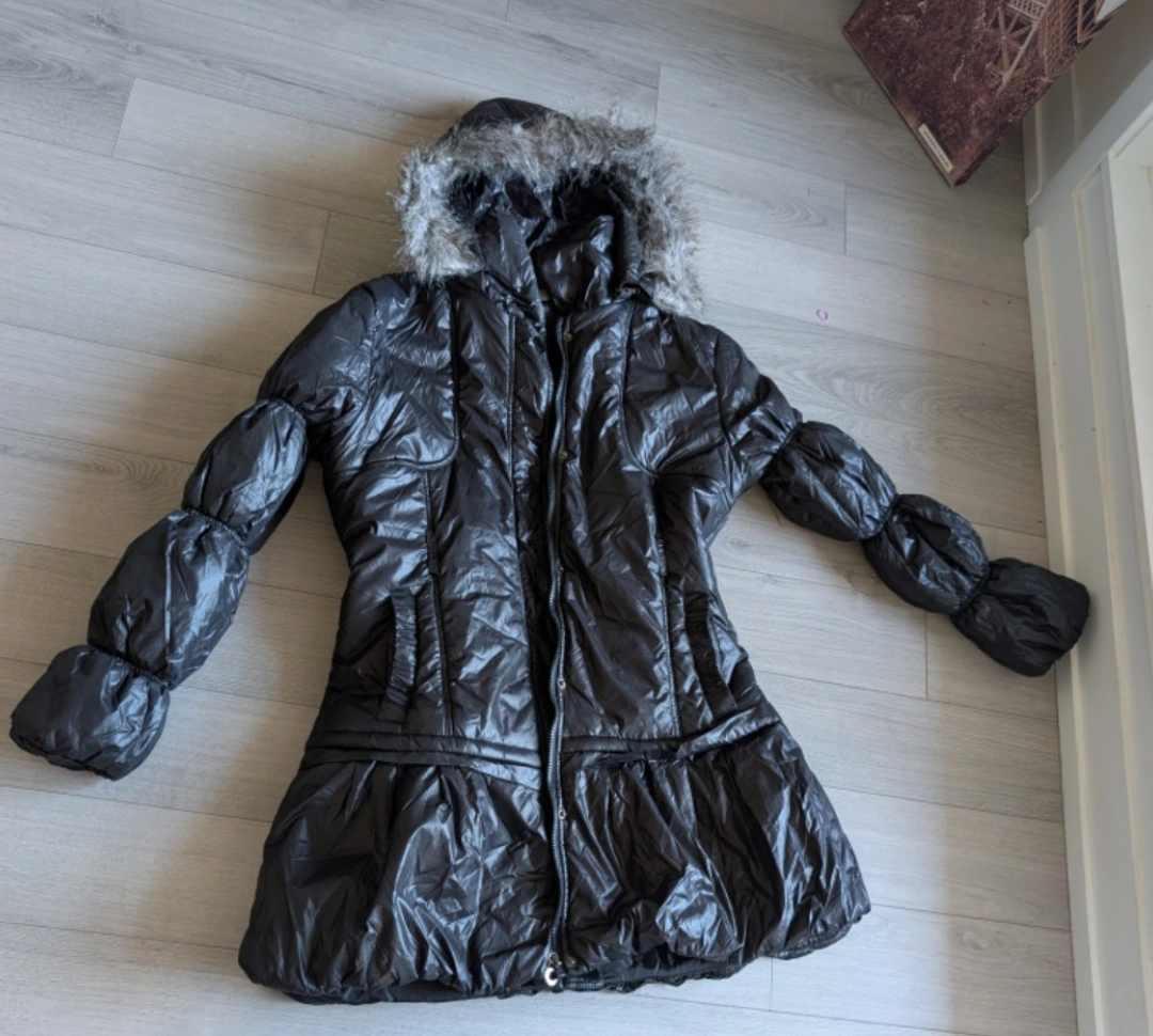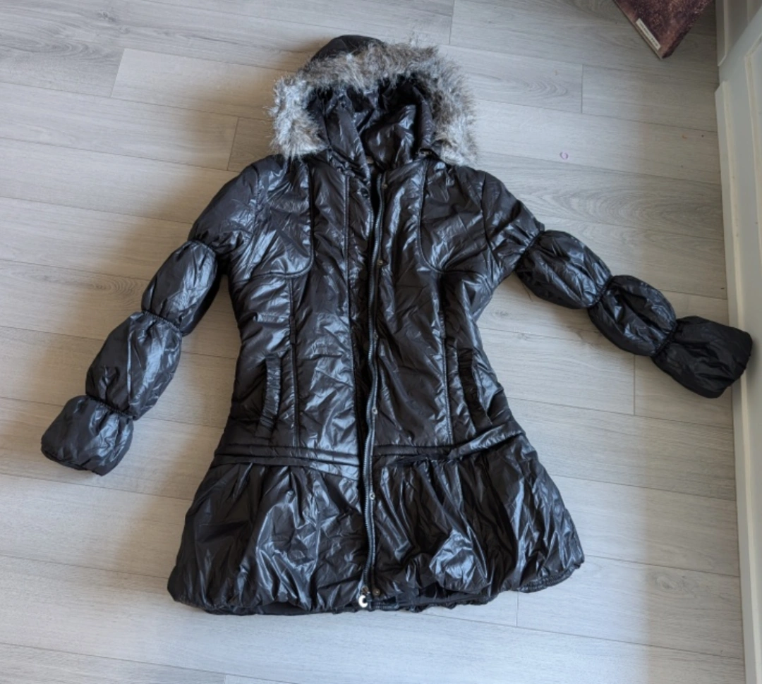 104Selling a stylish black puffer coat, perfect for staying warm during the colder months! It features a faux fur hood, adding a touch of elegance. This coat is in great condition and ready for a new home