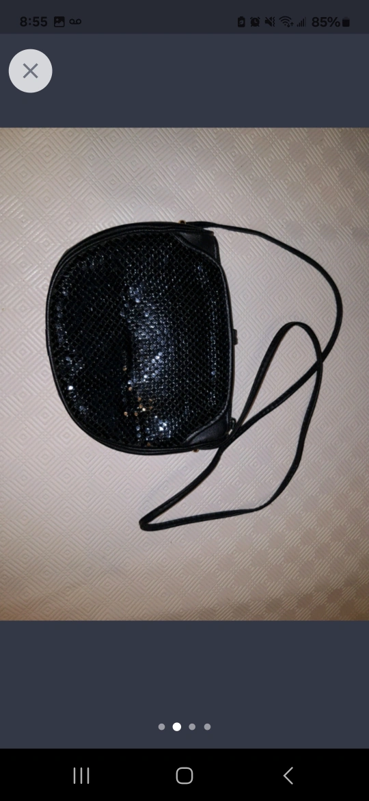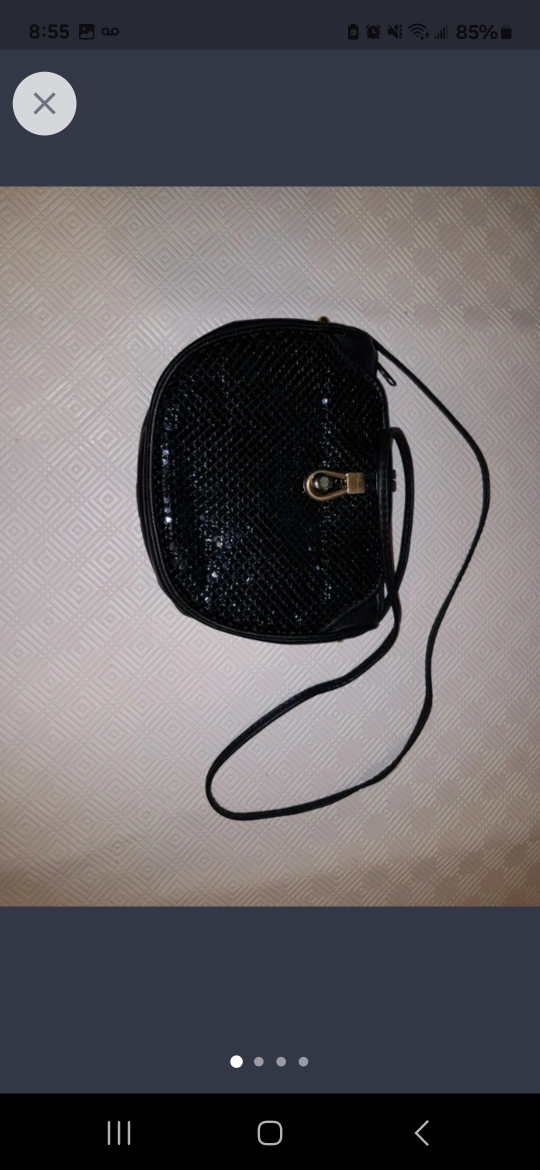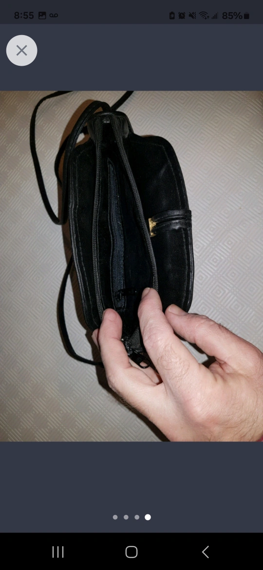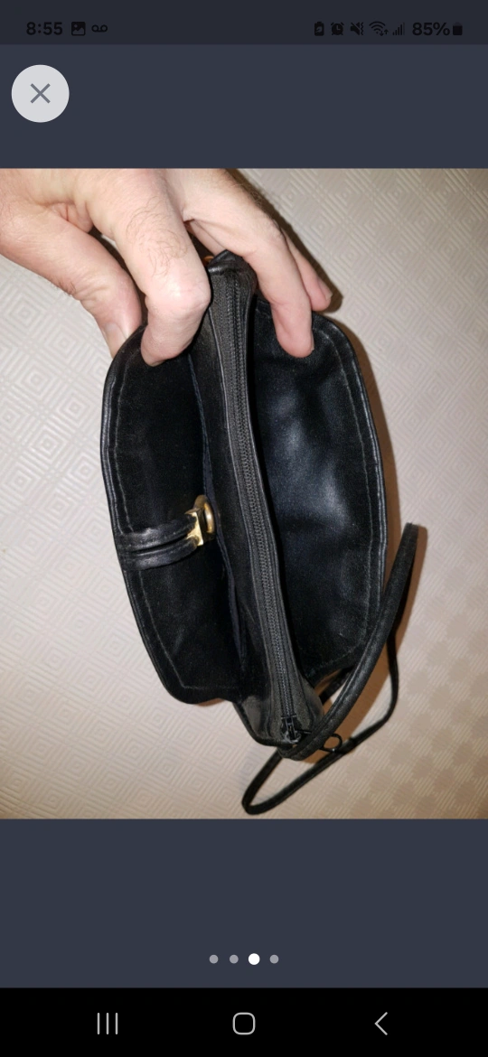 159" x 7" black leather purse. No rips or tears, both zippers open and close properly. Not sure if it's genuine leather or fake.