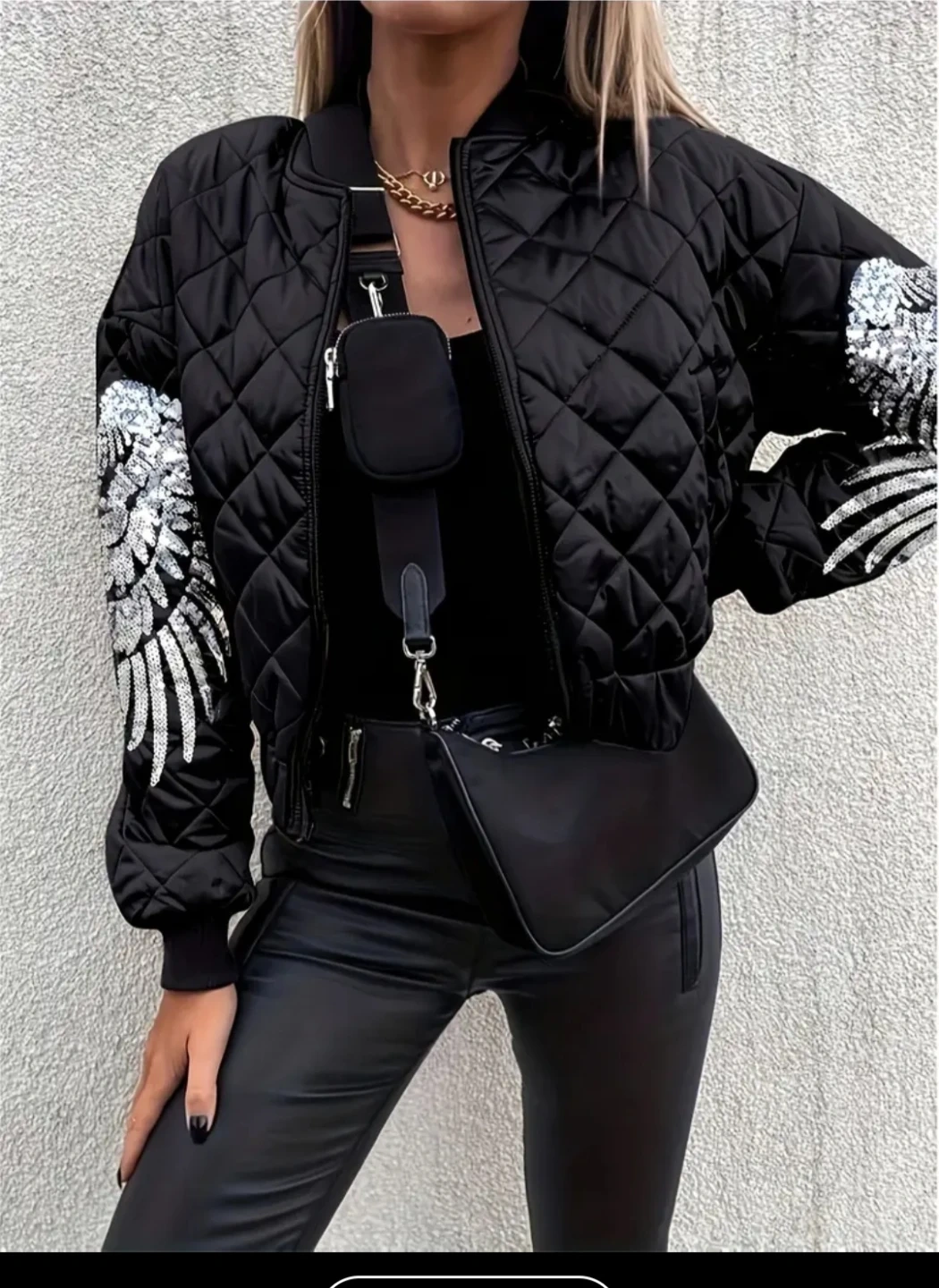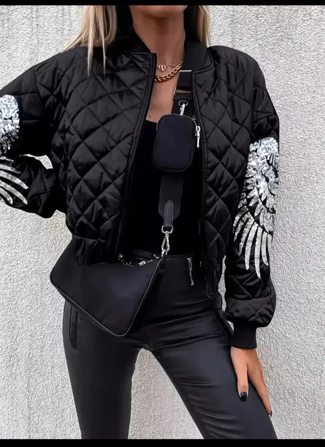 151This is a stylish black quilted bomber jacket✨️🧥 It features a unique wing design on the sleeves, adding a touch of flair to the classic bomber style. It's perfect for adding a bit of edge to your wardrobe!✨️🧥 LIGHTLY WORN✨️🧥 CURBSIDE PICK UP ONLY, 79 CLEARVIEW HEIGHTS, YORK, ON.