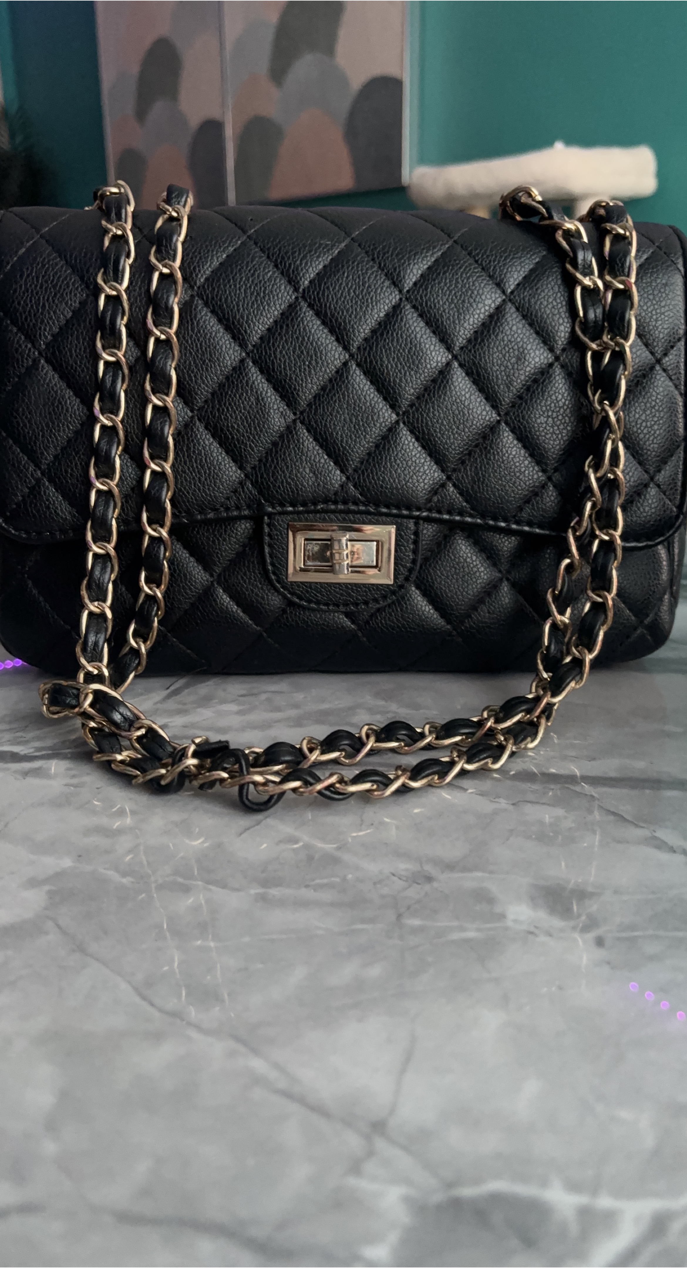 10A stylish black quilted bag with gold chain detailing. Perfect for adding a touch of elegance to any outfit!