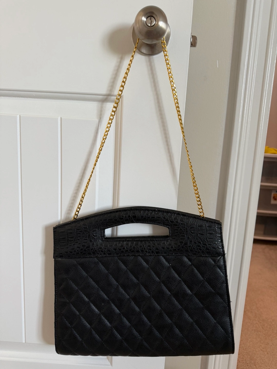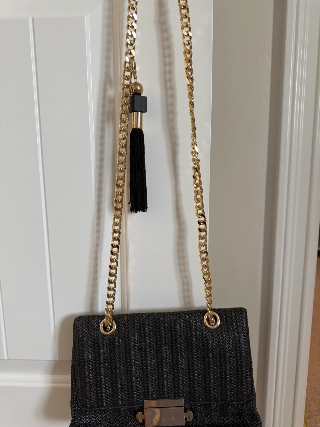 This is a stylish black bag with a quilted pattern and a gold chain strap. It's perfect for adding a touch of elegance to any outfit. The bag features a unique handle design and a tassel detail, adding to its charm. It's in great condition and ready for a new home