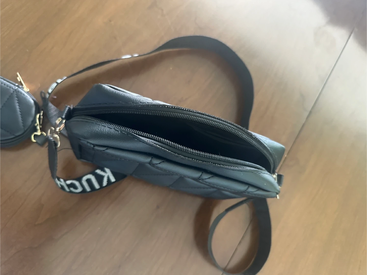 Cute black crossbody bag with a quilted design and a detachable small pouch! The strap has some text details on it. Perfect for carrying your essentials in style
