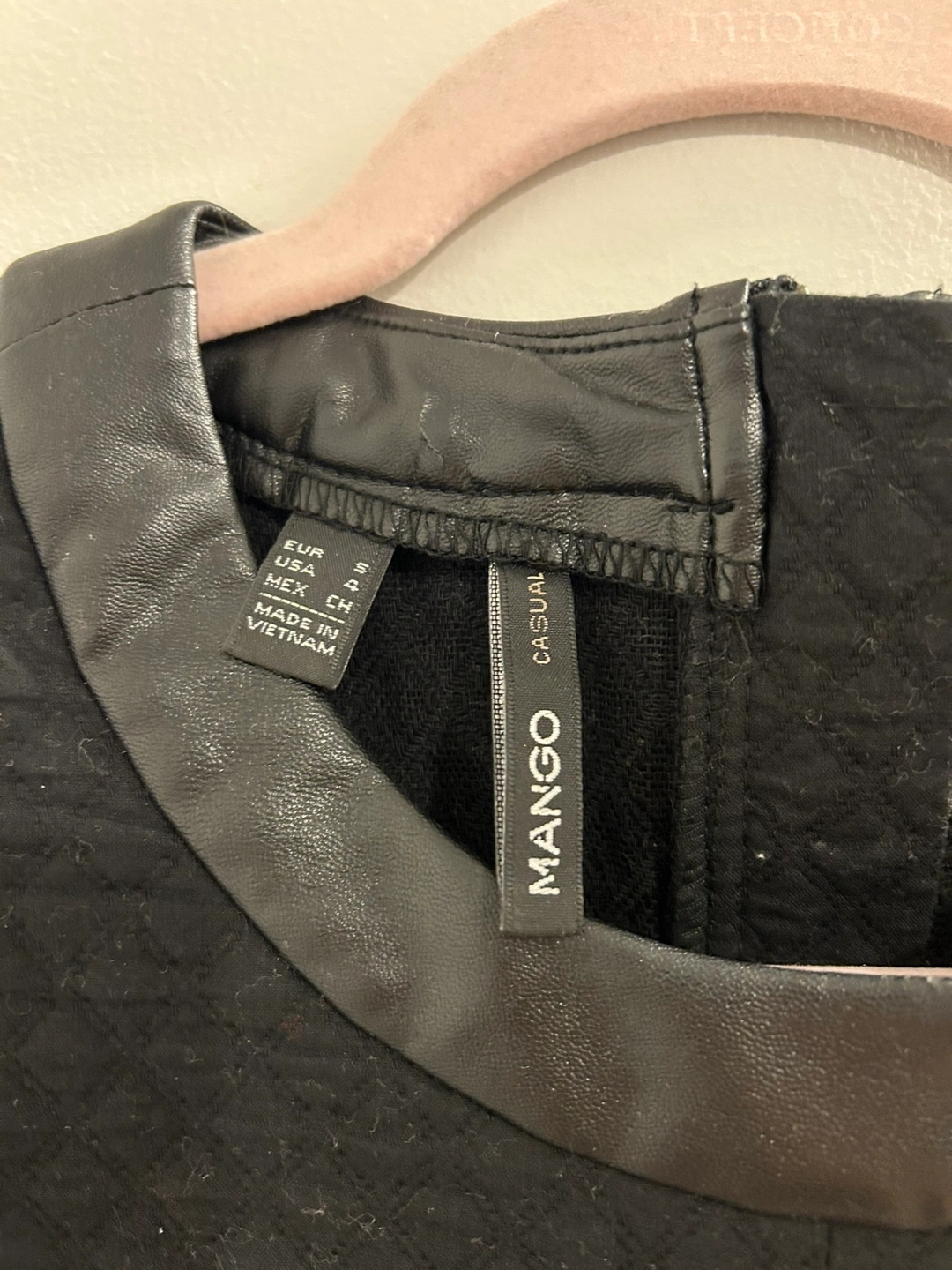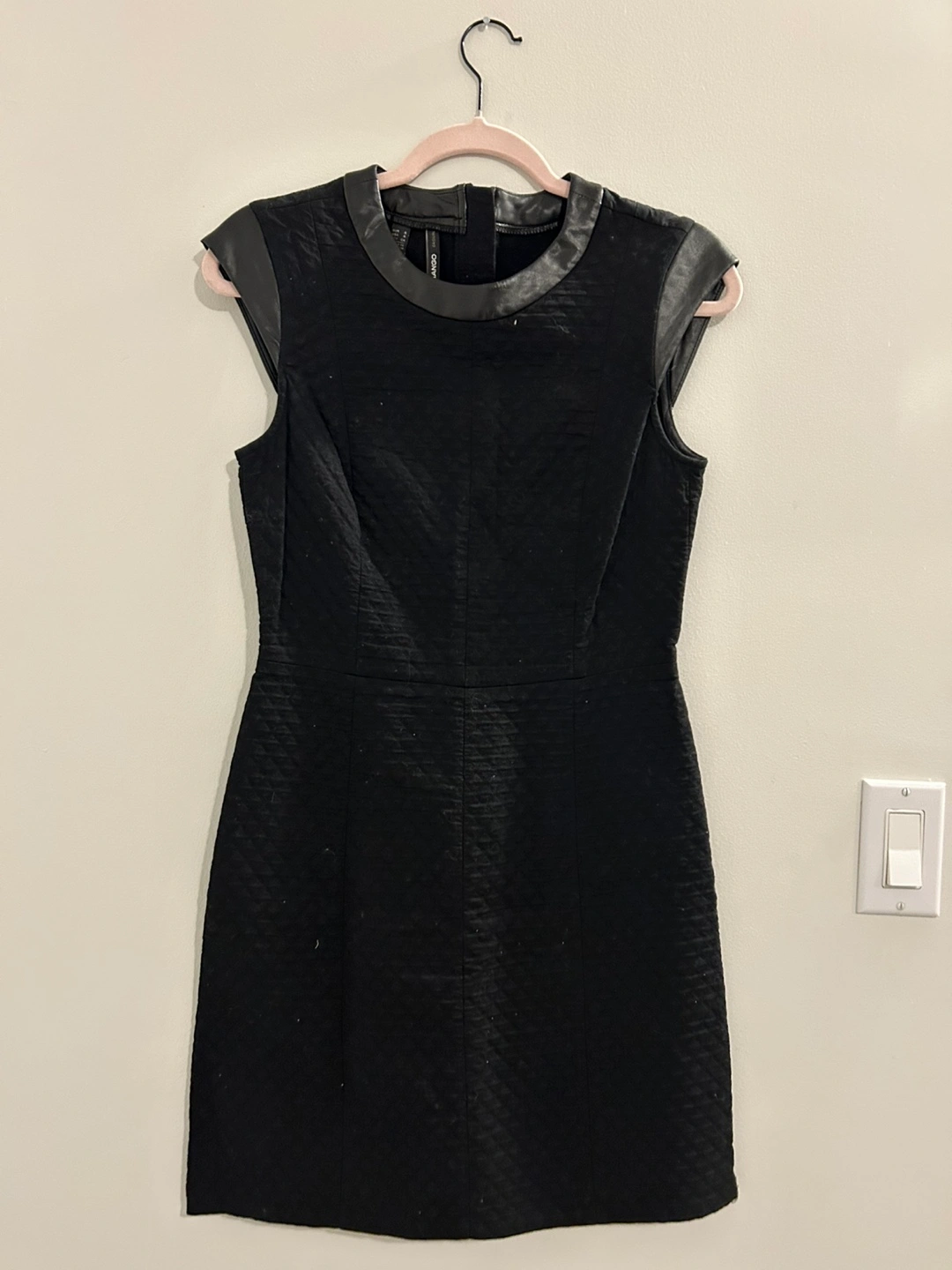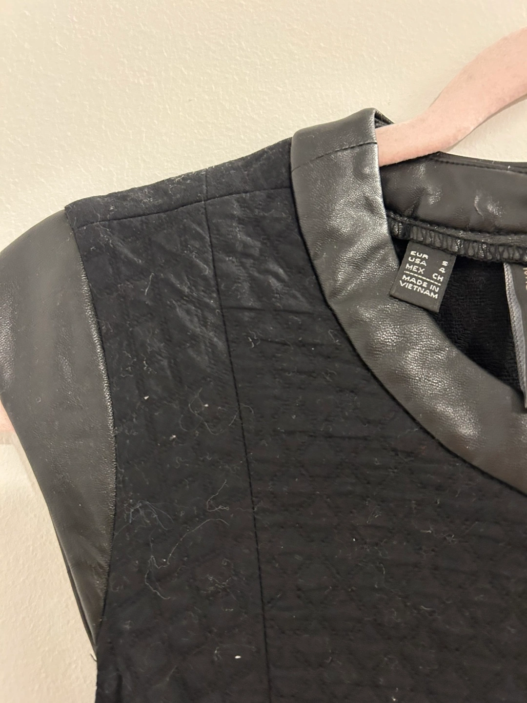 283Cute black mini dress. Quilted fabric with leather-look accents. Size small.