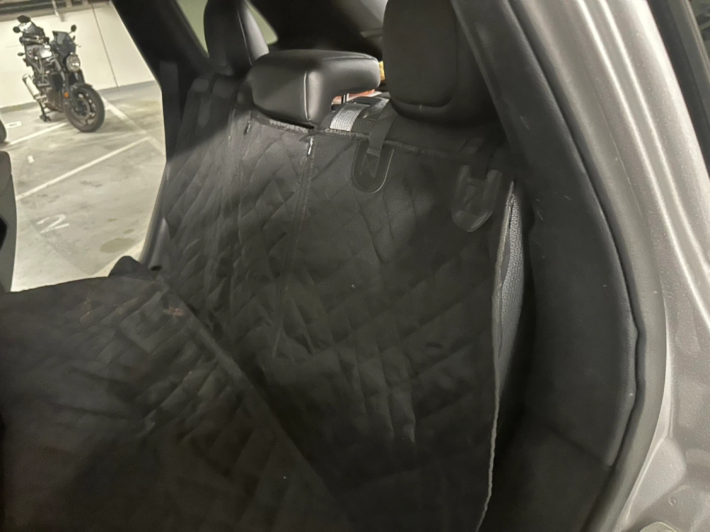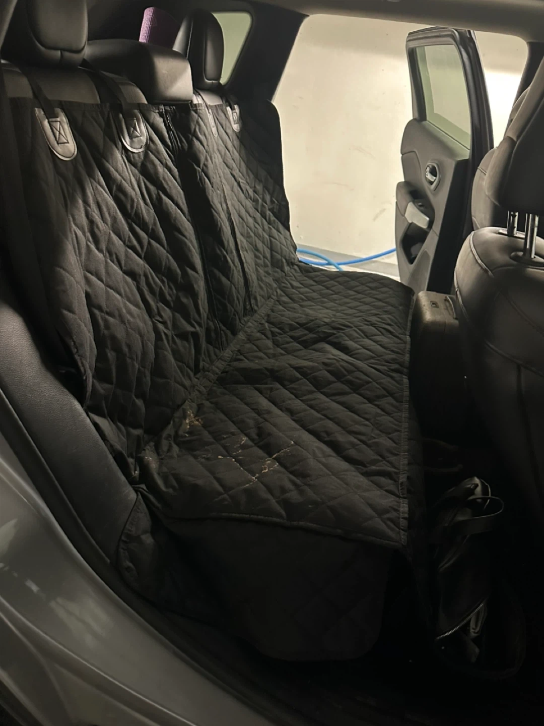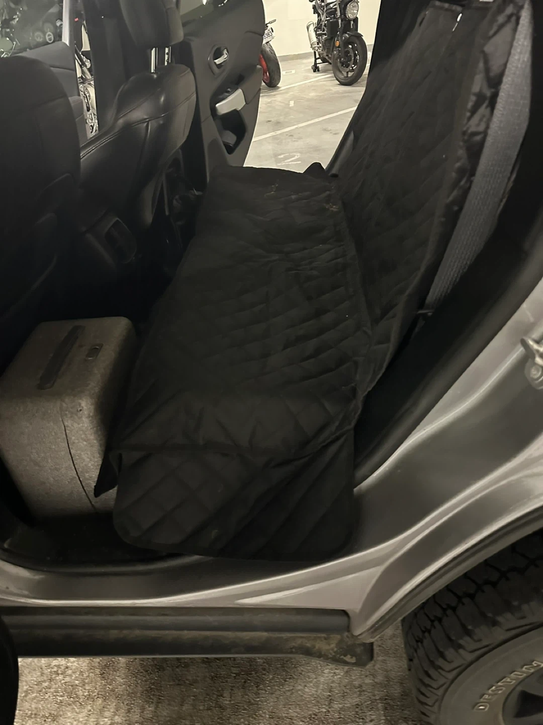 Selling a used black quilted pet car seat cover. It's in good condition and will help keep your car seats clean from pet hair and messes. Perfect for dog owners! Black back seat cover. Has side panels that cover front of seat and sides. Head rest straps and zipper console area. Fits back seat of Jeep Cherokee